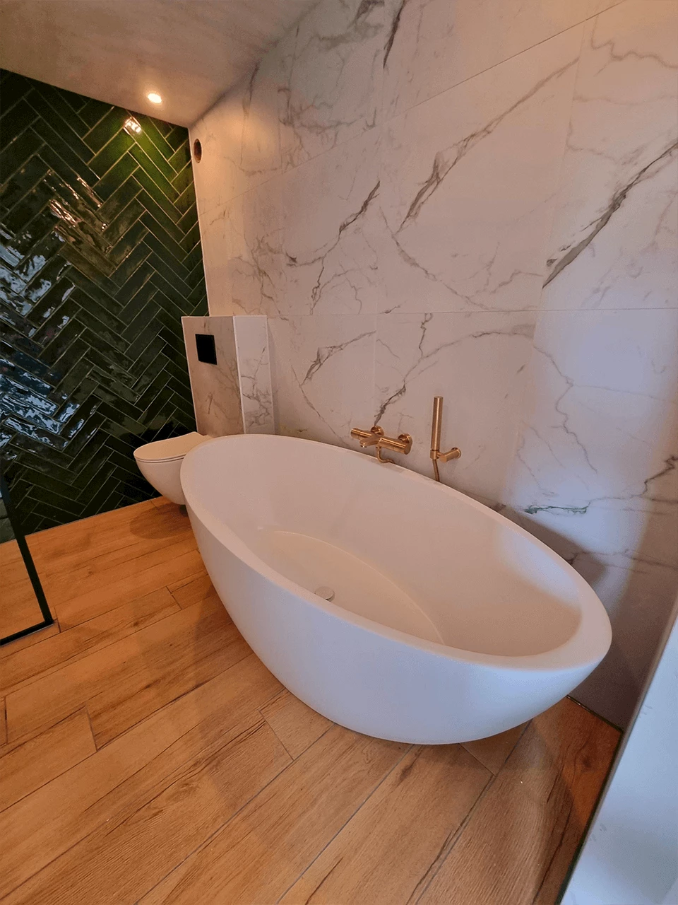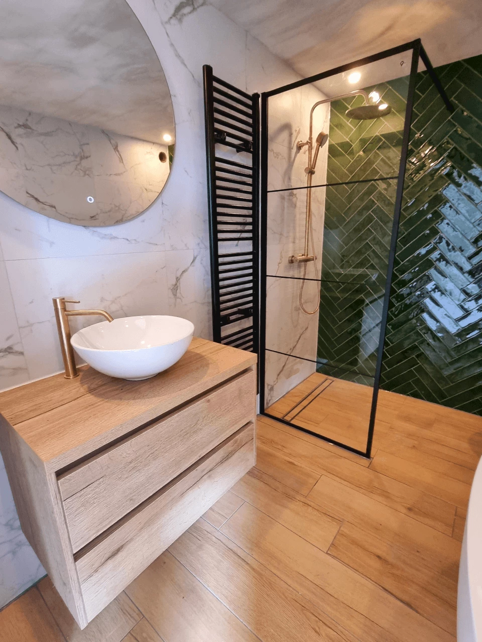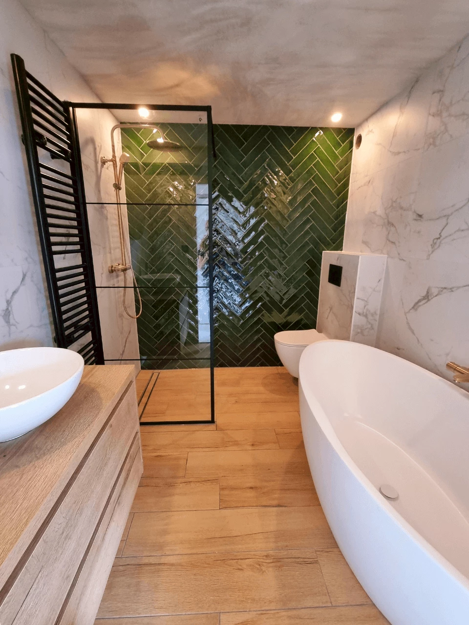 Wat direct opvalt, is de overgang van witte en grijze tinten naar een kleurrijk pallet. De familie koos namelijk voor warme houtlook vloertegels, in combinatie met marmertegels op de zijwanden en diepgroene wandtegels op de achterwand. Waar de vloer voor een warme en rustige basis zorgt, biedt de marmerlook een luxe sfeer en maken de groene in visgraat gezette tegels een speelsheid los in de ruimte. De goudkleurige messing kranen geven nog net dat extra zetje voor de luxe uitstraling van de badkamer en de mat zwarte elementen zorgen juist voor een wat stoerdere look. Een gewaagde combinatie, die we in deze badkamer prachtig uit de verf zien komen. En is je al opgevallen dat het toilet, het bad én de waskom mat wit zijn? Dit oogt net wat rustiger dan glanswit, waardoor de nadruk meer op de gekleurde elementen in de badkamer komt te liggen.