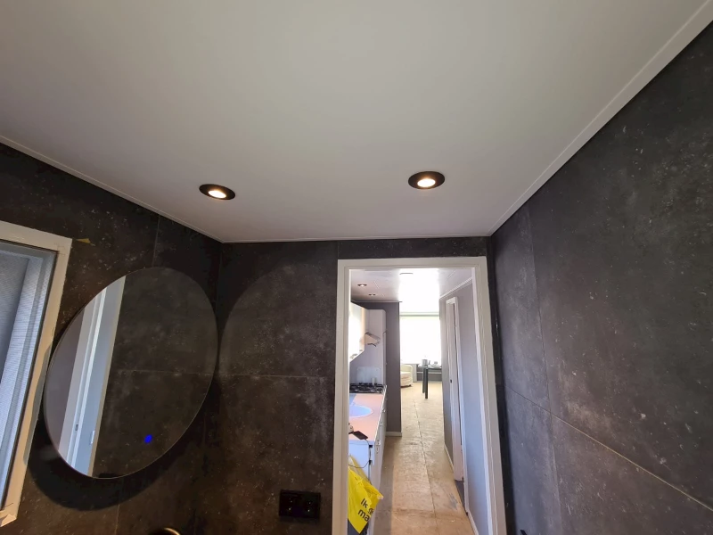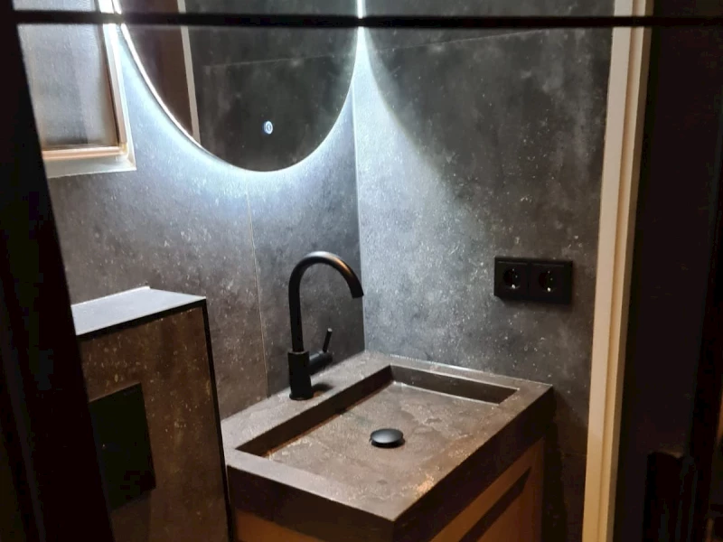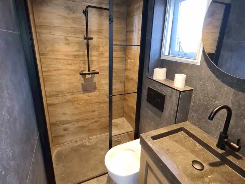 De sfeer van een badkamer wordt bepaald door de combinatie van de gekozen materialen en keuze. Zelfs in de meest kleine badkamer kan je een sfeervolle badkamer creëren die van alle gemakken is voorzien. Er is gekozen tussen een combinatie van antraciet betonlooktegels van 80x80cm in combinatie met houtlook tegels van 30x120 cm. In het douchegedeelte ligt een Xenz douchevloer inclusief putje in de kleur antraciet. De stoere black line douchecabine van Revital geeft een industriële uitstraling aan de badkamer. De opbouw regendouche van Blaauw Sanitair past perfect bij deze badkamerstijl. Het witte toilet komt ook van Blaauw sanitair. Het robuuste badmeubel is gemaakt van massief eiken en heeft een natuurstenen wastafel. E mat zwarte opbouw wastafelkraan is van Blaauw Sanitair. De ruime spiegel van Korver een heeft diameter van 60 cm. De ruimte wordt afgewerkt door een strak spanplafond met mat zwarte spots en dimmer van KP Plafonds.