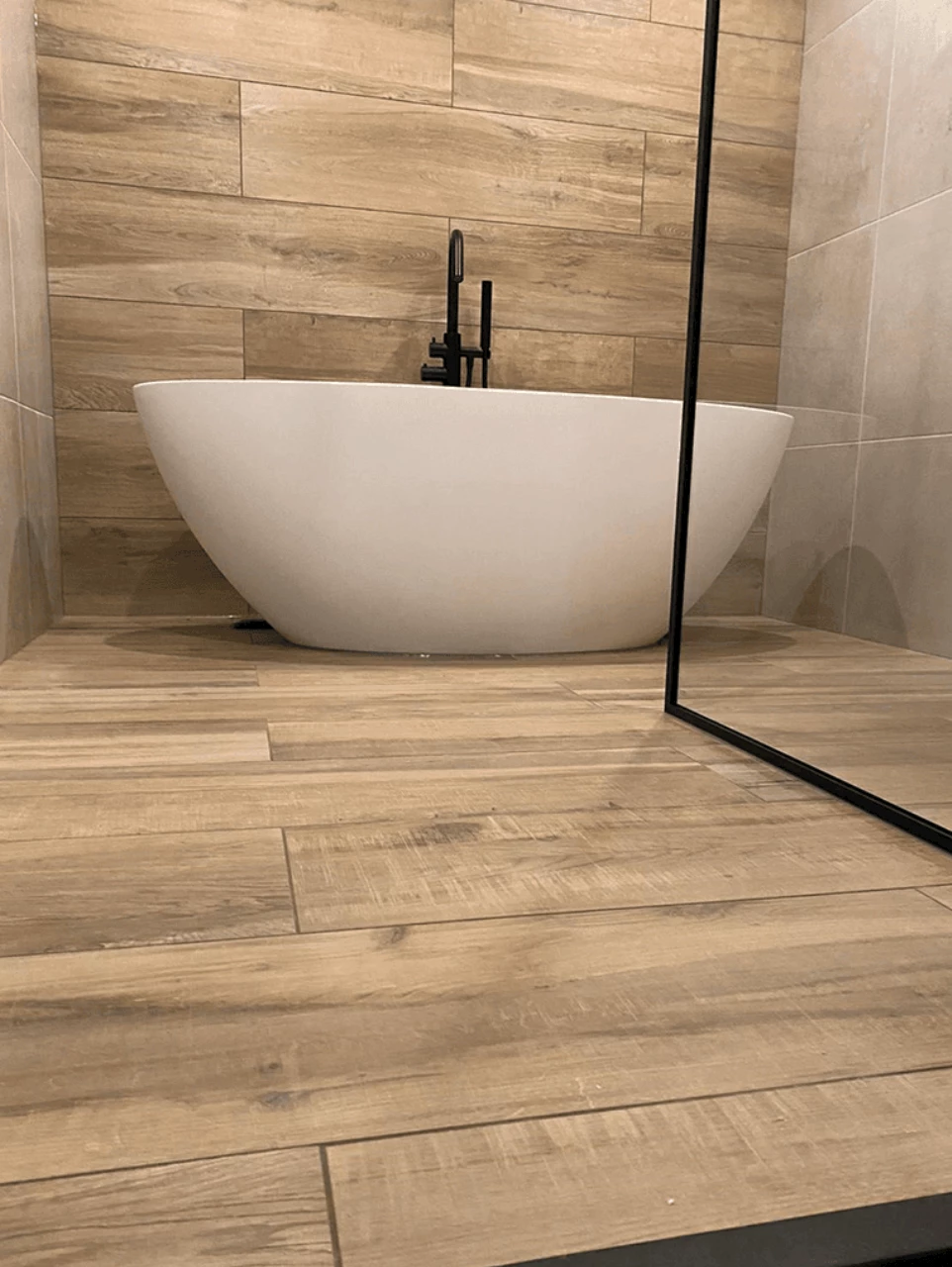 Gekozen is voor een tegel in de kleur hout in combinatie met een beige tegel, dit zorgt voor een sfeervolle uitstraling. Het badmeubel is van massief eiken en combineert mooi met de houten tegel. Het eiken is behandeld met een coating tegen het inwerken van vocht. Zo blijft het badmeubel mooi. Op het badmeubel is een solid surface opbouw wastafel geplaatst. Doordat de wasbak van solid surface is, gaat het lang mee. Dit materiaal is slijtvast, vlek werend en vochtbestendig. Om voor optimaal comfort te zorgen is er gekozen voor een vrijstaand bad van hoogwaardig acryl in een wit matte uitvoering. De kranen van het bad en de wastafel zijn in de uitvoering mat zwart. Het mat zwart komt terug in de douche, gekozen is voor een inloopdouche met mat zwarte regendouche en is voorzien van een mat zwarte douchewand. De douchewand is behandeld met een NANO-coating. Dit zorgt ervoor dat het materiaal water- en vuilafstotend is.