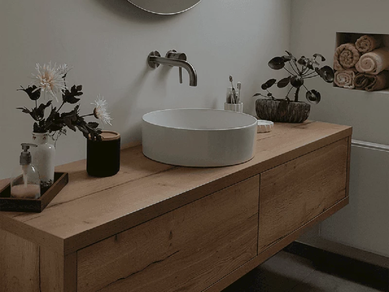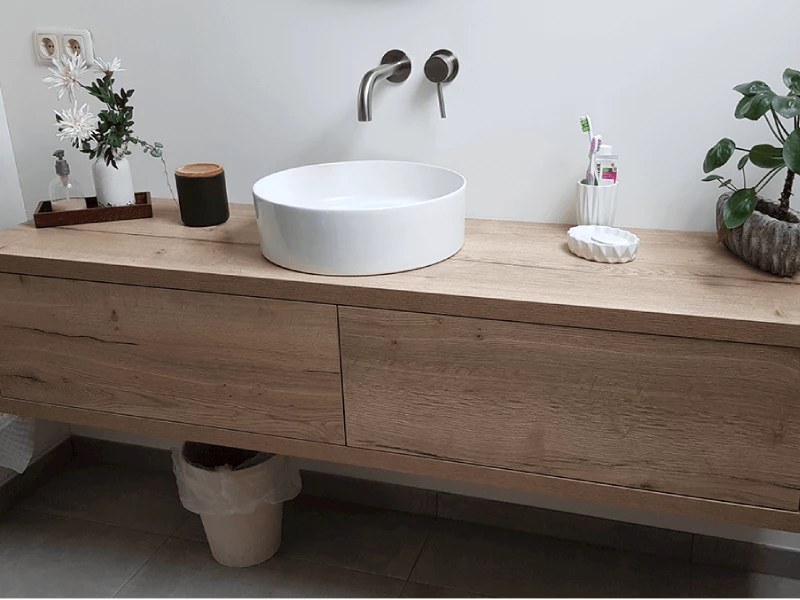 Gekozen is voor een badmeubel van natuur eiken. Daarop is een keramische waskom in de kleur wit geplaatst. Het voordeel van keramiek is dat dit materiaal bestand is tegen schoonmaakmiddelen en het slijt,- en kleurvast is. Bij de waskom is gekozen voor een chromen inbouwkraan van het merk Blaauw sanitair. Om het badmeubel af te maken is er een spiegel bevestigd die voorzien is van ledverlichting. Ook het toilet is van keramiek en is voorzien van een softclose zitting. De douche bestaat uit een glazen douchecabine met een greep van rvs. Ook de douchekraan en douchedrain zijn van rvs. Dit combineert perfect met de mat zwarte accessoires.