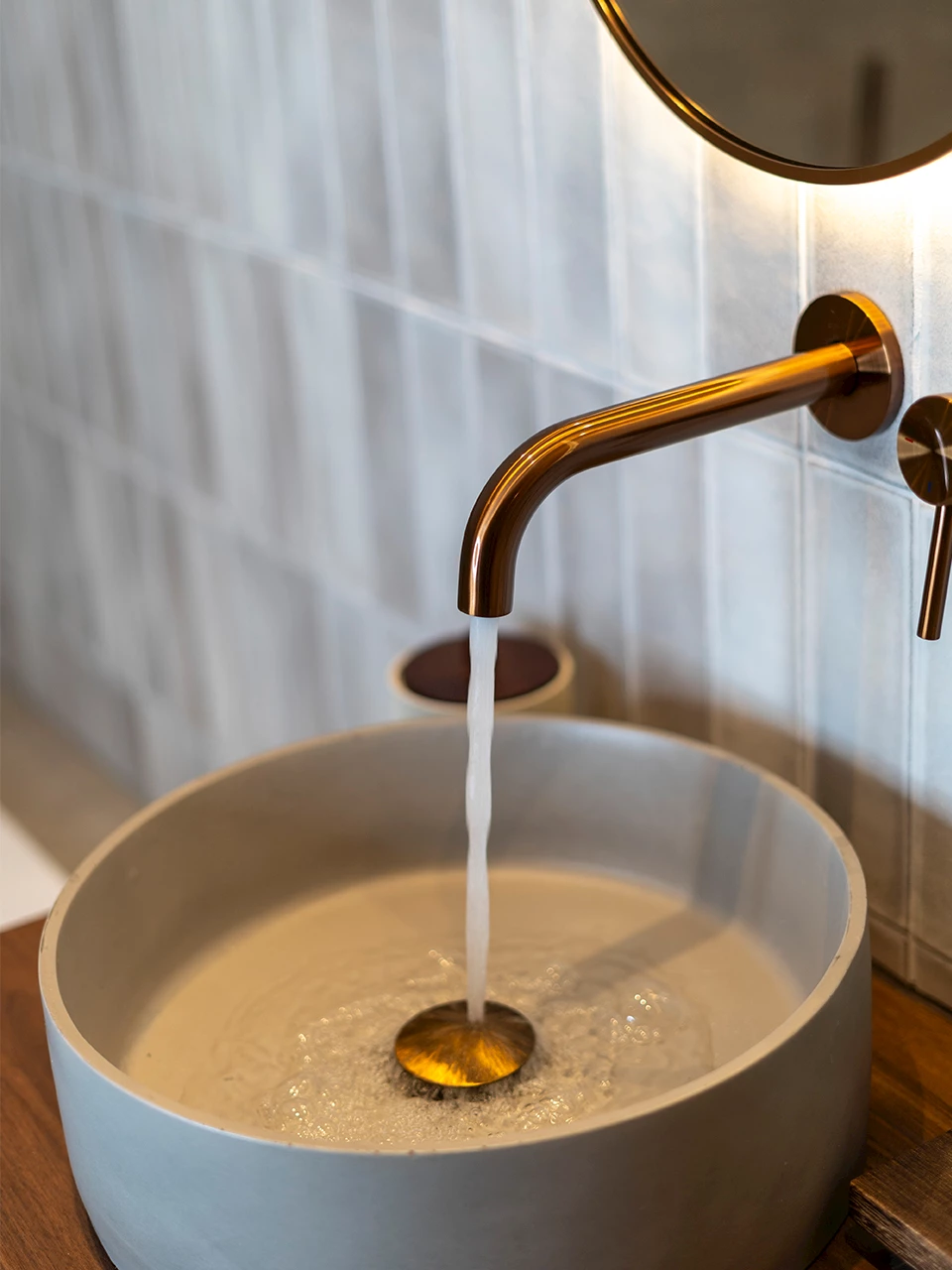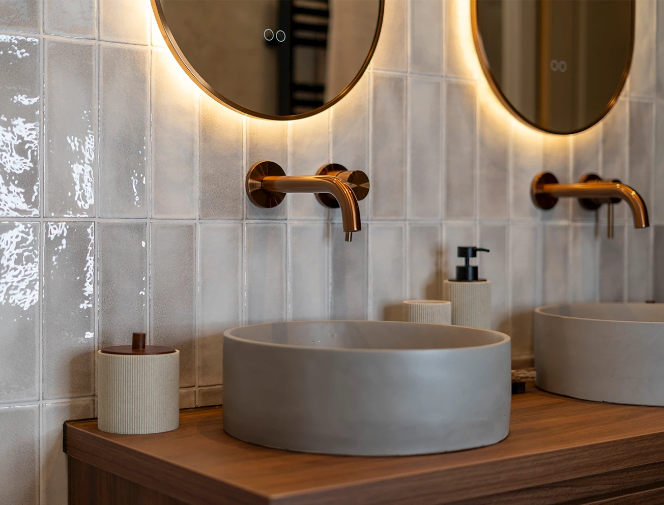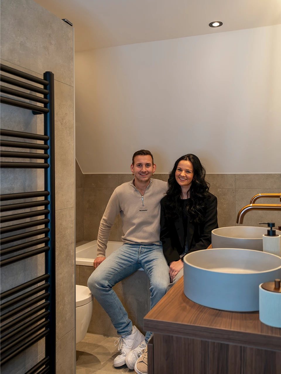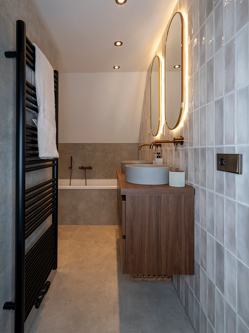 De grijze kleur van de badkamer komt niet alleen voor in de tegelcombinatie, maar ook in de badmeubelset. Karel en Mattanja hebben gekozen voor een notenhouten onderkast met twee betonnen waskommen in een grijze kleur. Aan dit geheel is een ovale spiegel met een koperkleurige omlijsting en koperkleurige wastafelkranen toegevoegd.