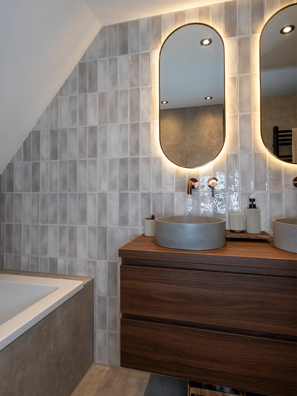 Dat grijs helemaal niet saai hoeft te zijn weet de familie Ras als geen ander te bewijzen. Zij hebben gekozen voor een stijlvolle combinatie van 60x60 in een greige tint en decortegels in de kleur Pearl. De decortegels zijn een speelse toevoeging aan de badkamer en zorgen voor de trendy look.