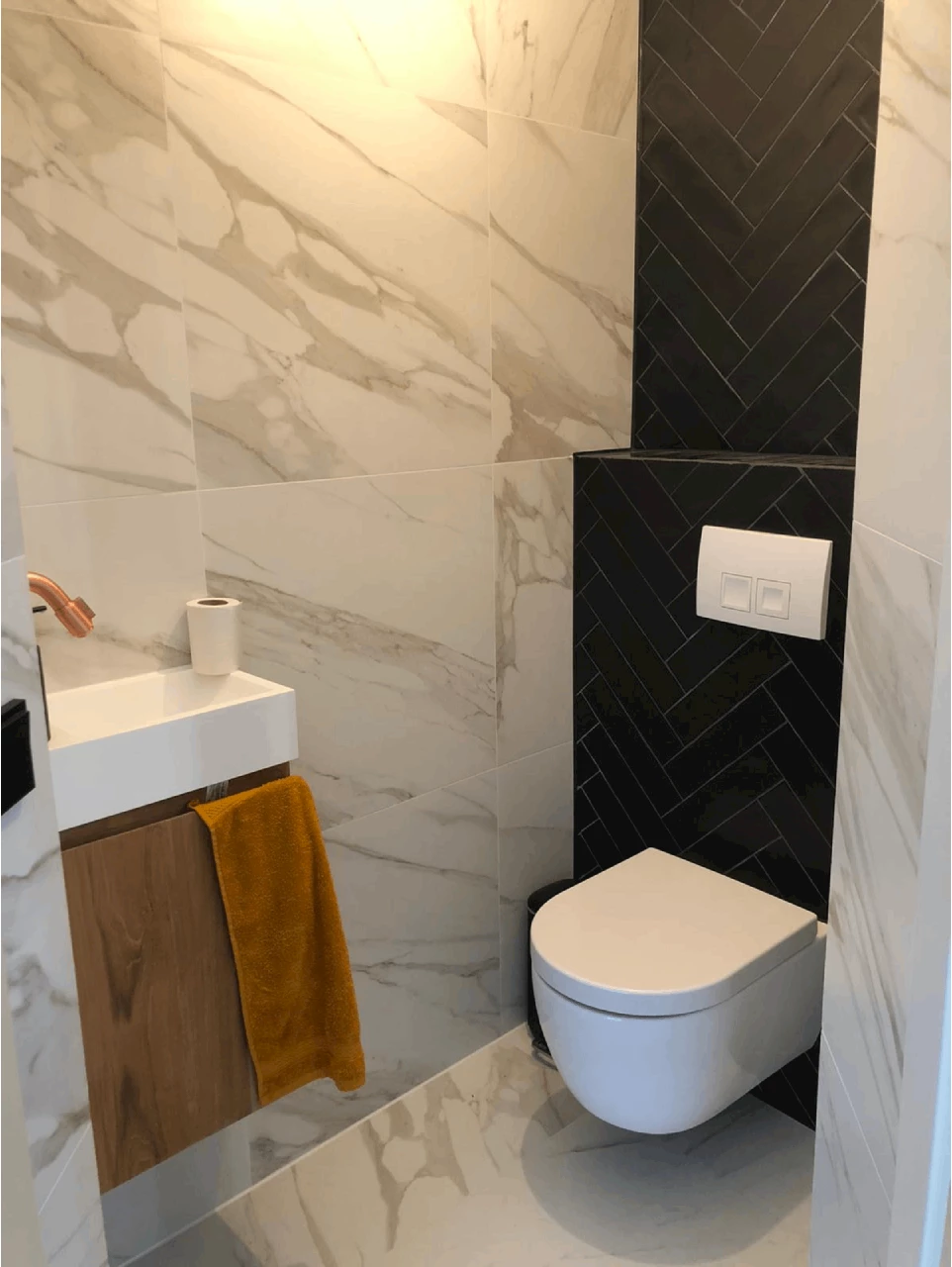 Marmerlook tegels hebben een chique uitstraling en straalt rust uit en zijn eenvoudig toe te passen in verschillende badkamerstijlen. In deze badkamer is gekozen voor een keramische marmerlook tegels. Deze hebben dezelfde exclusieve uitstraling als echt marmer, alleen zijn deze veel goedkoper én onderhoudsvriendelijker. De tegels zijn kras- en slijtbestendig. Marmer geeft een chique uitstraling geeft en straalt ook rust uit. Een marmerlooktegel oogt modern, is tijdloos en past bij meerdere badkamerstijlen.
