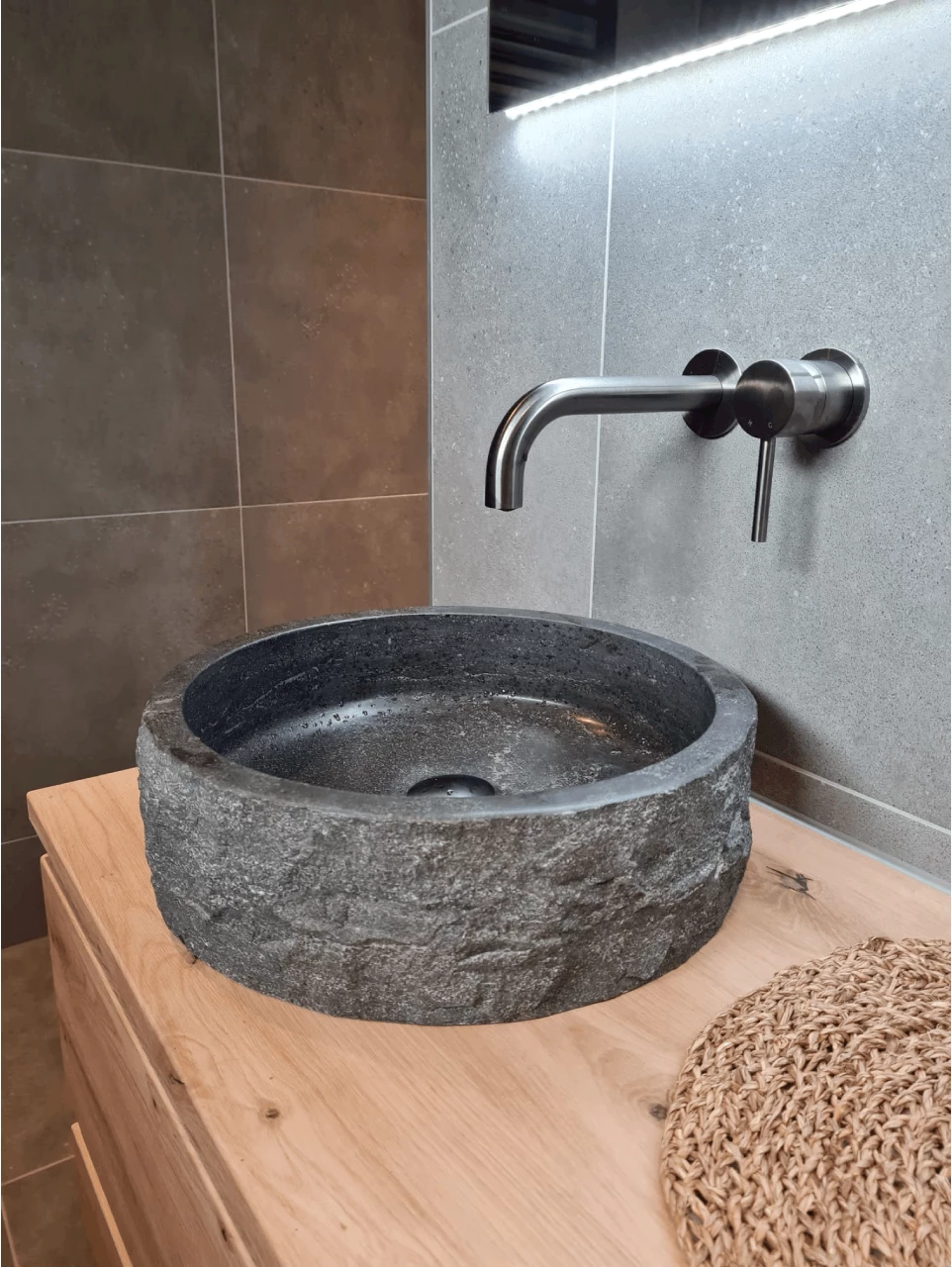 De basis van de badkamer bestaat uit lichte betonlook wand- en vloertegels. Deze combinatie wordt aangevuld door de houtlook tegels die zijn aangebracht op de achterwand van de douche. De houtlook komt ook terug in het badmeubel, deze heeft de kleur Solid Eiken. Boven op dit badmeubel is een natuurstenen waskom geplaatst, door de grove afwerking wordt de betonlook uitstraling van de badkamer versterkt. Gekozen is voor inbouwwastafelkranen in de kleur Gun Metal, dit is een echte trendkleur die we steeds vaker terugzien in de badkamer. Boven het badmeubel hangt een spiegel met sfeerverlichting aan de onderkant en verlichting aan de bovenkant. Om extra opbergruimte te creƫren zijn er hoge kasten geplaatst. Deze hebben dezelfde kleur als het badmeubel, wat zorgt voor eenheid in de badkamer. De douchecombinatie bestaat uit een ingebouwde regendouche en een handdouche, beide hebben de kleur Gun Metal. Om ervoor te zorgen dat het water niet de badkamerruimte inloopt, is er een brede douchedrain geplaatst. Erg praktisch, maar natuurlijk ook zeker mooi voor het oog! Na het douchen wil je natuurlijk ook niet in een koude ruimte stappen, daarom is er en zwarte radiator opgehangen.