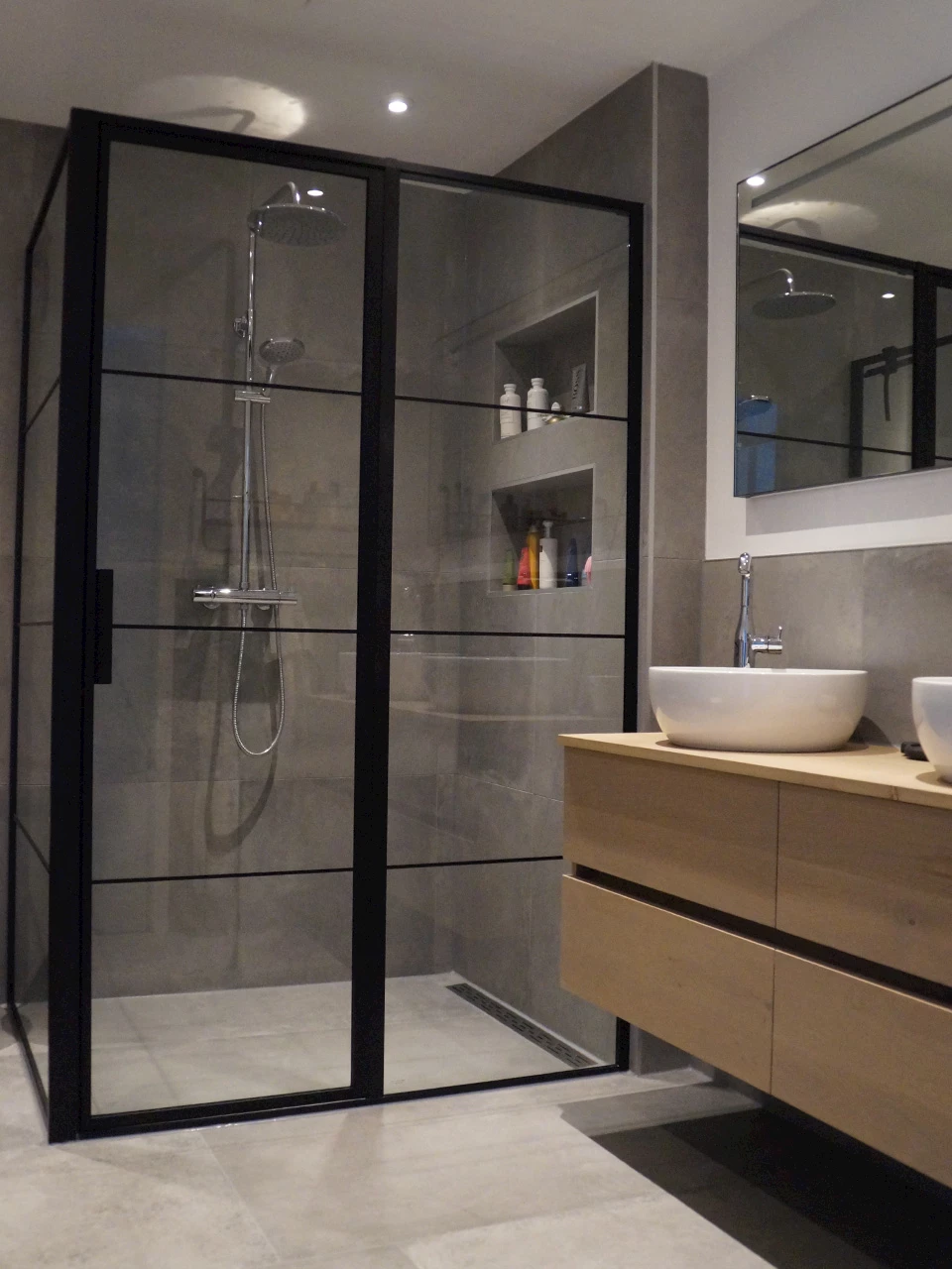 Ook de stijl van de badkamer is compleet afgestemd op de wensen van de familie. De betonlook wand- en vloertegels ogen modern en geven de badkamer – zeker in combinatie met de zwarte elementen – een licht industrieel tintje. In de praktische nisjes naast de opbouwdouche zijn tegels in hexagonvorm toegevoegd voor een speelt effect. Er zijn hele bewuste keuzes gemaakt qua kleurstelling in combinatie met deze tegels. Kijk bijvoorbeeld naar de mat zwarte frames in de douchewand- en deur in combinatie met meerdere zwarte accessoires. Maar ook rvs komt in meerdere elementen in deze badkamer terug. Daarnaast vormt het badmeubel met de kleur Smoke Oak een prachtige aanvulling op het gehele plaatje. Op deze manier ontstaat er een mooi geheel van verschillende materialen en kleuren, die perfect met elkaar matchen.