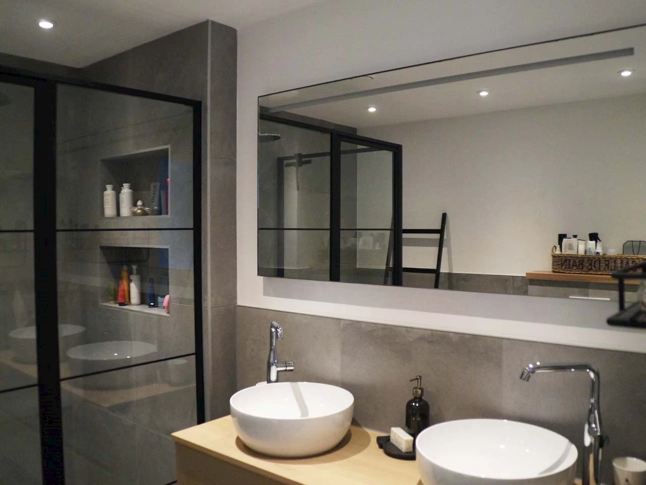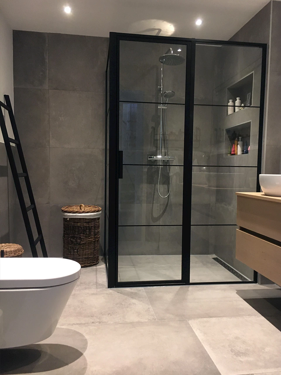 De familie heeft hun droombadkamer zelf prachtig afgestyled met passende accessoires. Kijk bijvoorbeeld eens naar de zwarte ladder, die niet alleen stijlvol maar ook nog eens erg praktisch is. Het leuke van een redelijk neutrale badkamer qua kleuren en materialen, is dat je deze helemaal naar je eigen stijl kunt aankleden. En als je hierop bent uitgekeken, kan je de accessoires na een aantal jaar altijd vervangen of anders indelen. Zo gaat jouw droombadkamer nooit vervelen!