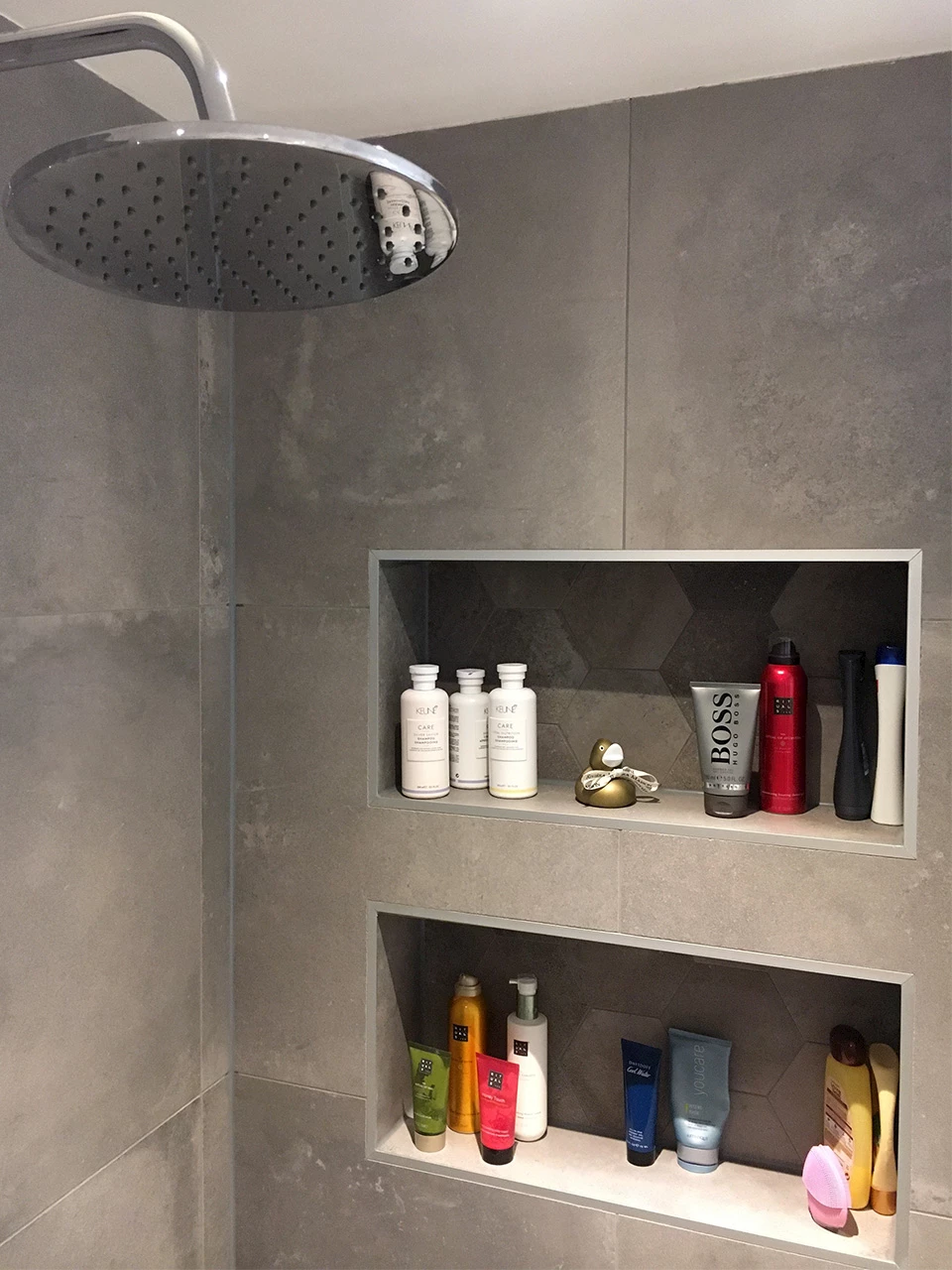 Naast de luxe elementen, is er natuurlijk ook nagedacht over het gebruiksgemak in de badkamer. Zo vind je naast de luxe regendouche ook een ronde handdouche mét massagefunctie, waarmee je makkelijk snel je haren kunt wassen of van de fijne massagestraal kunt genieten. Hiernaast zorgen de nisjes die in de muur zijn verwerkt voor een stijlvolle en moderne manier om de doucheproducten op te bergen. Dat scheelt ook een hoop schoonmaakwerk wanneer een apart rekje op de muur wordt geplaatst.