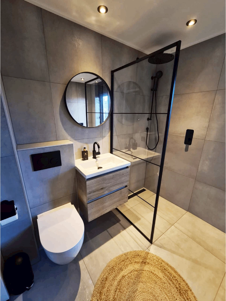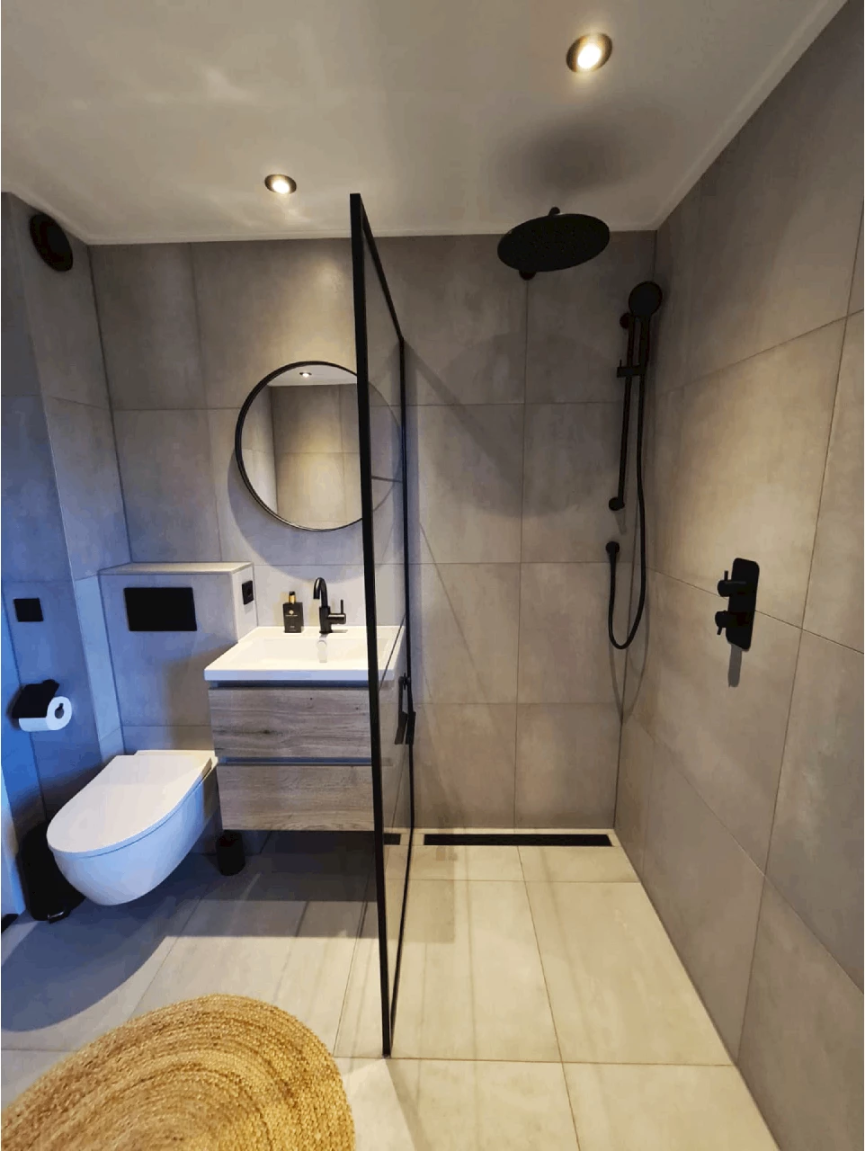In Barneveld heeft Sani4All een fantastische industriële badkamer opgeleverd. Het gebruik van donkere kleuren, stoere materialen en moderne details zorgen voor een mooi geheel. Er is gekozen voor 1 soort tegel op de vloer en wand wat een rustige stoere basis vormt van de ruimte. Het is een keramische betonlook tegel in de afmeting 60 x 60 cm.