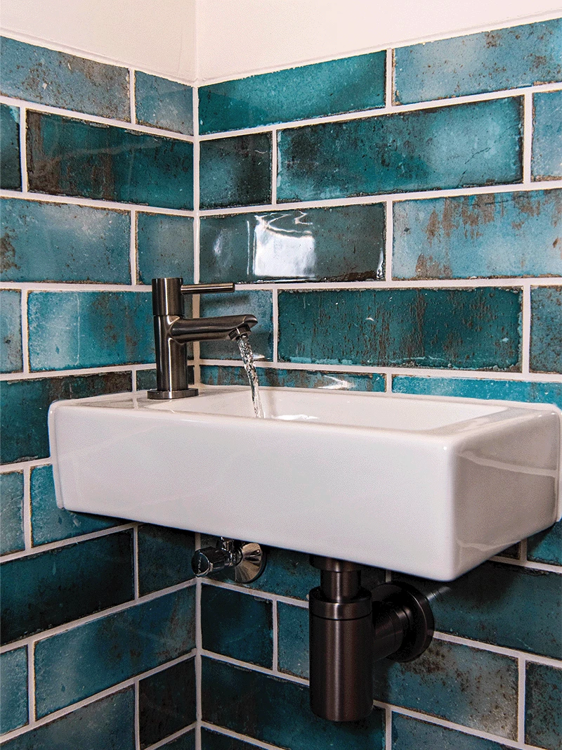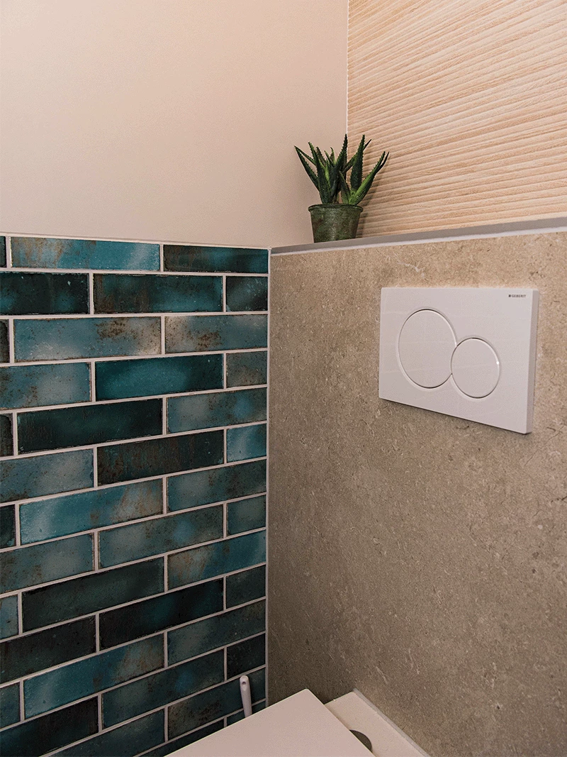 De basis van de tweede toiletruimte is gelijk aan die van de eerste. Ook hierbij koos de familie voor zandkleurige vloer- en wandtegels, lichte houtlook tegels en wit sanitair. Het verschil zit in de blauwe decortegels die op twee wanden zijn geplaatst. Deze geven de ruimte een veel modernere en wat stoerdere uitstraling met zich mee. Je ziet duidelijk dat een kleine aanpassing veel invloed kan hebben op de stijl en sfeer van je toiletruimte.