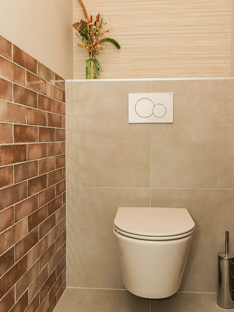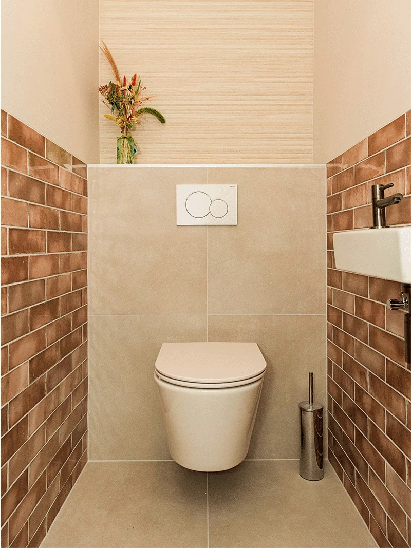 Naast de badkamer heeft de familie ook twee nieuwe toiletruimtes uitgezocht. De eerste toiletruimte heeft een warme, luxe look. De tegelcombinatie bestaat uit zandkleurige vloer- en wandtegels, lichte houtlook tegels met een reliëf en de unieke terracotta decortegels. Ondanks de keuze voor drie verschillende tegels oogt de toiletruimte niet druk. Dit komt door het witte sanitair en de Gun Metal accenten.