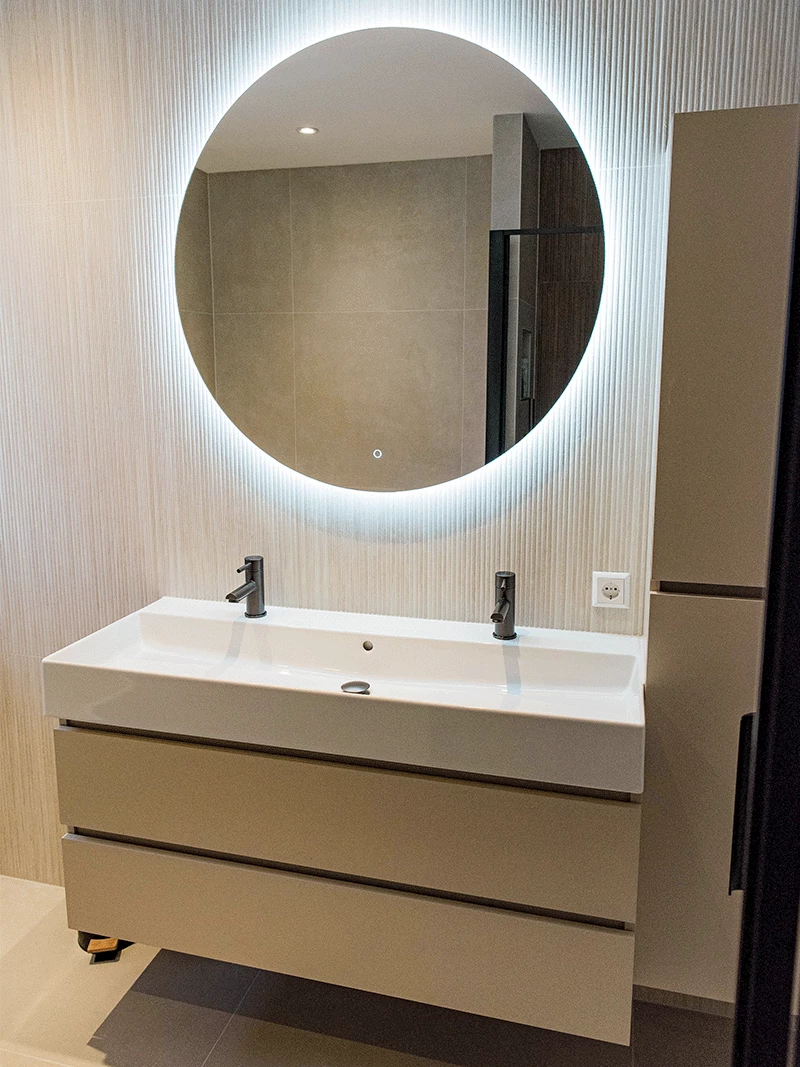 De badkamer van de familie Boot is een oase van rust. Ze hebben ervoor gekozen om het grootste deel van de ruimte te voorzien van zandkleurige vloer- en wandtegels. Dit is aangevuld met lichte én donkere houtlook tegels met reliëf. De combinatie van licht en donker zorgen voor een stijlvol contrast. Ook in de badmeubelset komt de keuze voor lichte, neutrale kleuren terug. Zowel de onderkast als de kolomkast zijn uitgevoerd in de kleur Sand. Alle kranen in de badkamer hebben de kleur Gun Metal, wat de eenheid en rust in de badkamer versterkt.