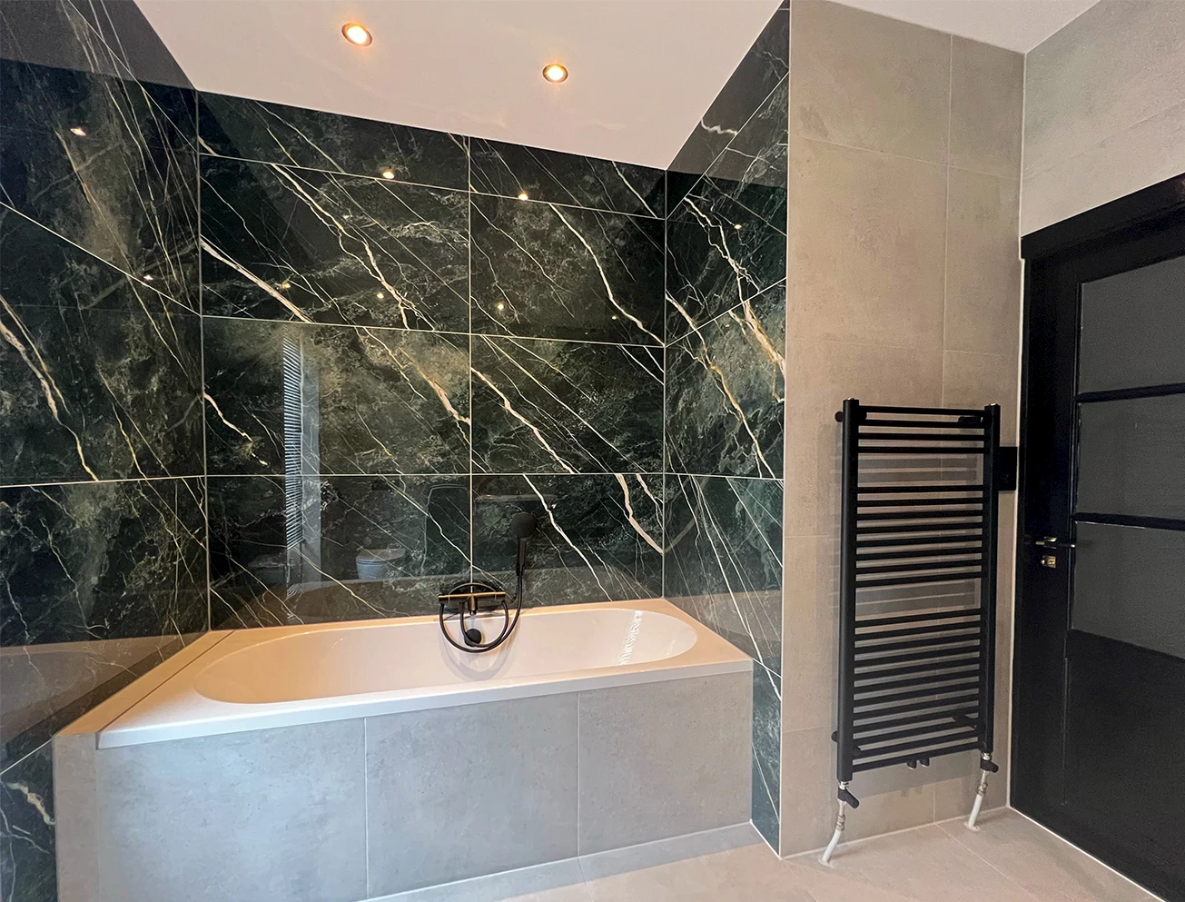 Je oog valt waarschijnlijk direct op de groene marmerlook tegels, welke de kleur Wacom Moss hebben. Deze vormen echt de eyecatcher van de badkamer. De tegels zijn gecombineerd met lichte vloer- en wandtegels in de kleur Pearl. Deze hebben een wat meer ingetogen uitstraling, waardoor de marmerlook tegels nog meer tot hun recht komen.