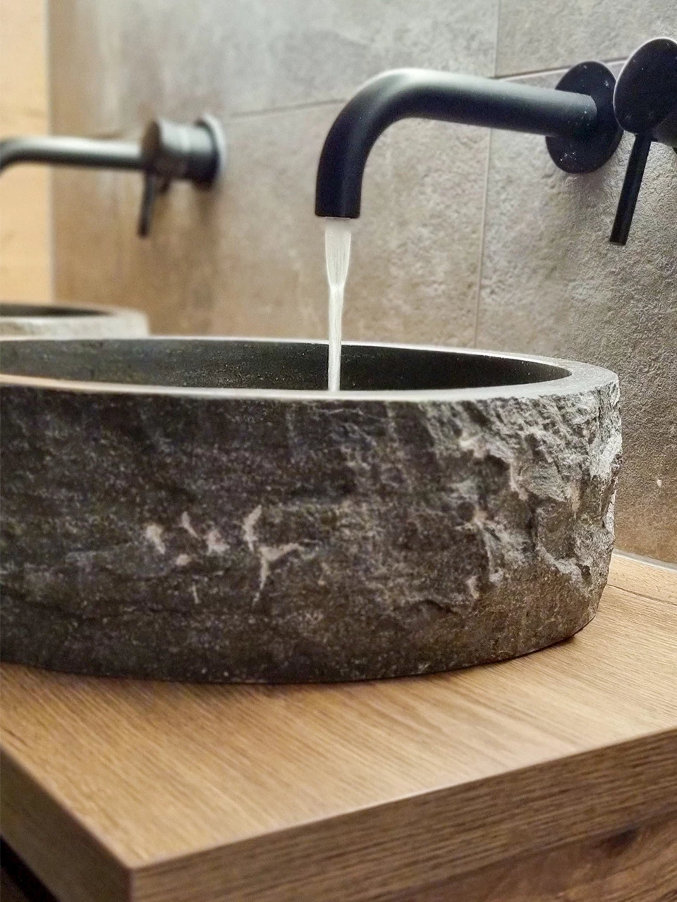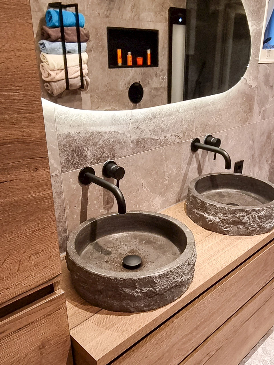 Ook bij de badmeubelset is er gekozen voor natuurlijke elementen. De onderkast van het meubel heeft de kleur Tabacco, een warme houtlook. Op de onderkast zijn twee hardstenen waskommen geplaatst, welke de wellness uitstraling versterken. De set wordt afgemaakt door een organische spiegel met ledverlichting. Om ervoor te zorgen dat er voldoende opbergruimte in de badkamer is, is er ook een kolomkast aan de set toegevoegd.