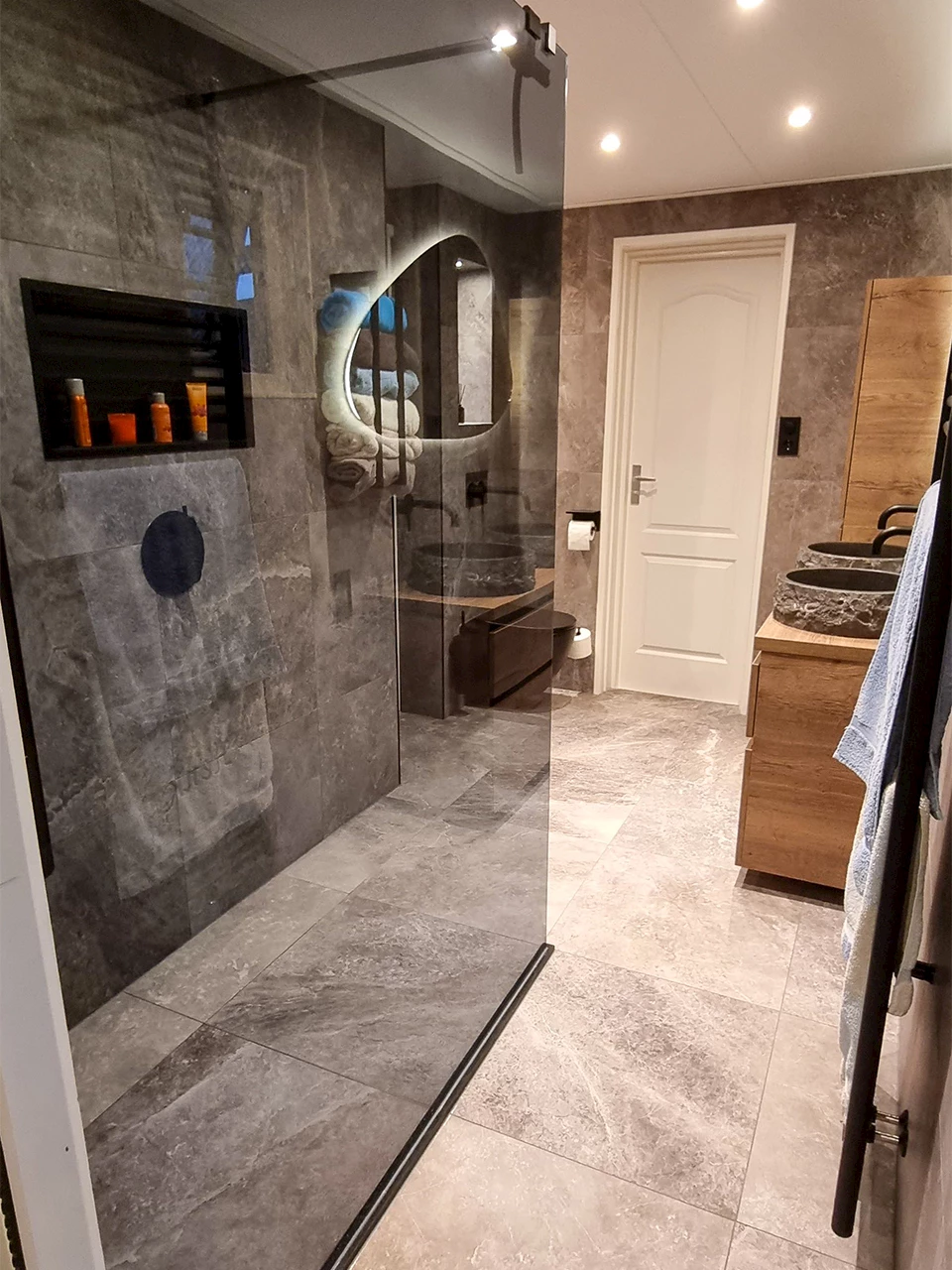 De heerlijke Sunshower en luxe regendouche zorgen ervoor dat je in de badkamer helemaal tot rust kunt komen. Maar een wellness badkamer kun je niet alleen creëren door te kiezen door luxe sanitair, ook door natuurlijke kleuren en materialen met elkaar te combineren. De familie Fokkens heeft bijvoorbeeld gekozen voor vloer- en wandtegels in de kleur Autentica Cenere. Deze tegels hebben een natuurlijke look, wat dus goed bij een wellness badkamer past. Daar hebben zij een kleine moderne touch aan gegeven door in het nisje te kiezen voor hexagon tegels in het mat zwart.