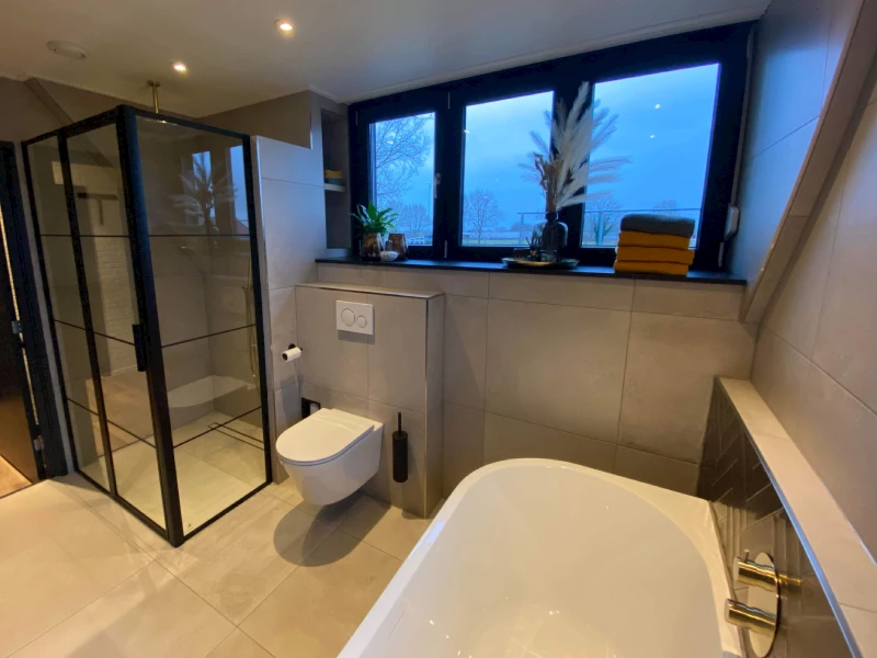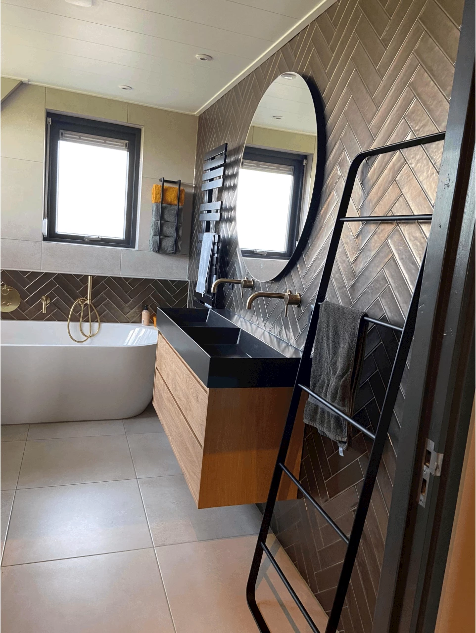 Waar we voorheen zagen dat er vaak voor een inbouwligbad werd gekozen, zien we nu steeds meer semi-vrijstaande baden in de badkamer verschijnen. Deze baden worden net zoals inbouwligbaden tegen de muur geplaatst. Waar bij een inbouwligbad het bad volledig wordt ingebouwd, worden er bij een semi-vrijstaand bad een of meer wanden vrijgelaten. Hierdoor blijft de vorm van het bad behouden, wat zorgt voor een luxe uitstraling. Deze familie heeft ook gekozen voor een semi-vrijstaand bad, waarbij er drie zijdes van het bad vrijstaand zijn. Naast een luxe uitstraling, zorgt het in deze badkamer ook voor een ruimtelijk effect.