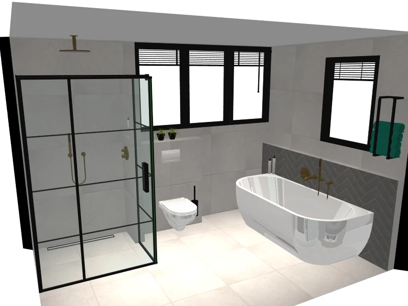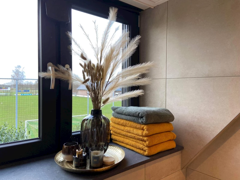 Naast een heerlijke regendouche heeft de familie ook gekozen voor een semi-vrijstaand bad. Ook hierbij hebben zij gekozen voor goudkleurige kranen, dit zorgt voor eenheid in de ruimte. Een element in de badkamer dat vaak vergeten wordt bij het vervangen van de ruimte, is het plafond. Vaak is het plafond wel aan vervanging toe door het vele vocht in de ruimte. Daarom is ervoor gekozen om het plafond in deze badkamer te vervangen door een nieuw plafond met ledverlichting. De familie Goossens heeft extra sfeer aan de badkamer toegevoegd door accessoires te plaatsten. Zo hebben ze onder andere gekozen voor een mat zwart handdoekenrek, maar ook de vaas met droogbloemen is een prachtige toevoeging.