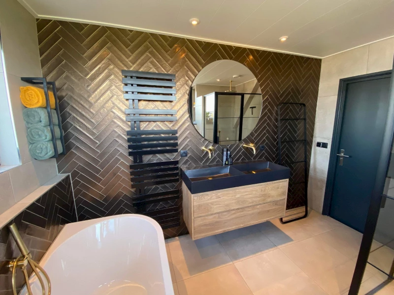 Sani4All Varsseveld heeft bij de familie Goossens uit Vragender deze luxe badkamer met een uniek element opgeleverd. De bronzen decortegels zijn een echte eyecatcher!