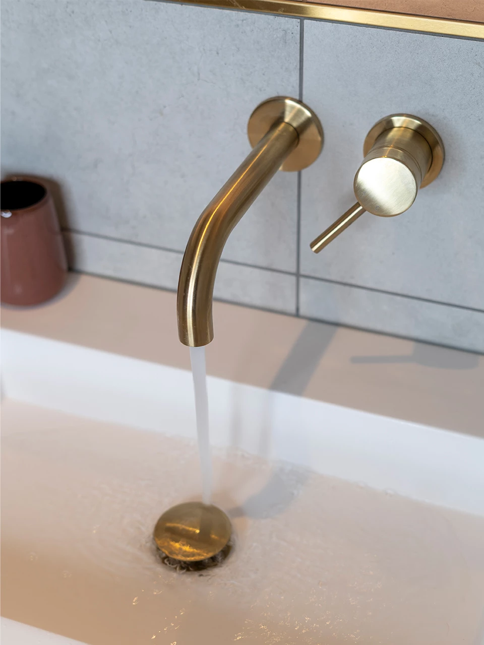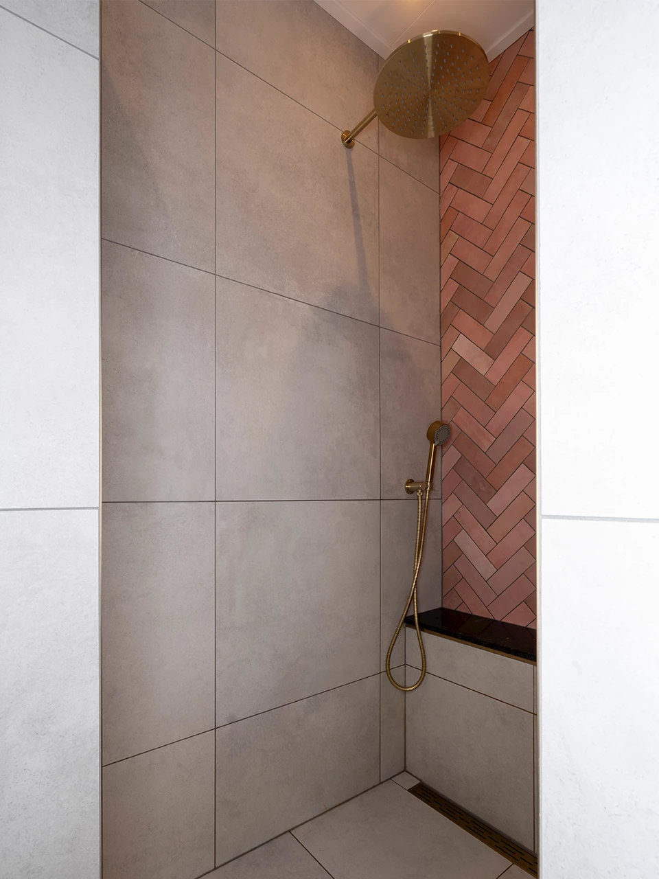 Om eenheid in de badkamer te creëren komen de goudkleurige elementen op verschillende plekken terug. In de doucheruimte heeft de familie gekozen voor een goudkleurige regendoucheset en een goudkleurige inbouwnis. De inbouwnis is niet alleen heel erg mooi, maar ook ideaal om je doucheproducten in neer te zetten! Om wat extra opbergruimte te creëren zijn er naast de doucheruimte tussen beide wanden drie houtlook planchets geplaatst.