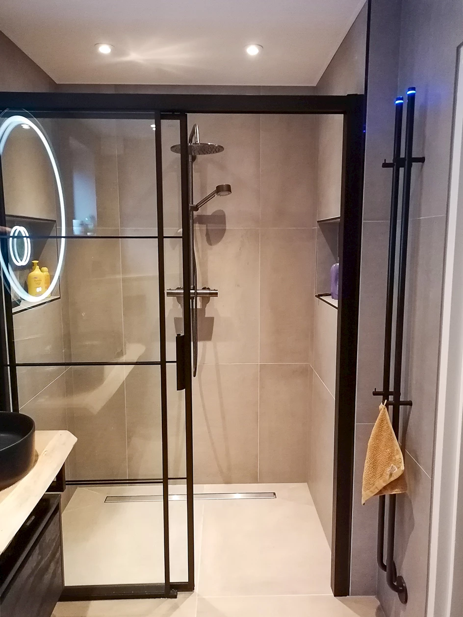 Niet alleen de opbouwkranen hebben de kleur Gun Metal, ook de luxe regendoucheset heeft deze prachtige kleur. De douche schuifdeur heeft een mat zwarte kleur, wat mooi combineert met Gun Metal. Ook de handdoek droger heeft een mat zwarte kleur, waardoor er eenheid ontstaat in de ruimte.