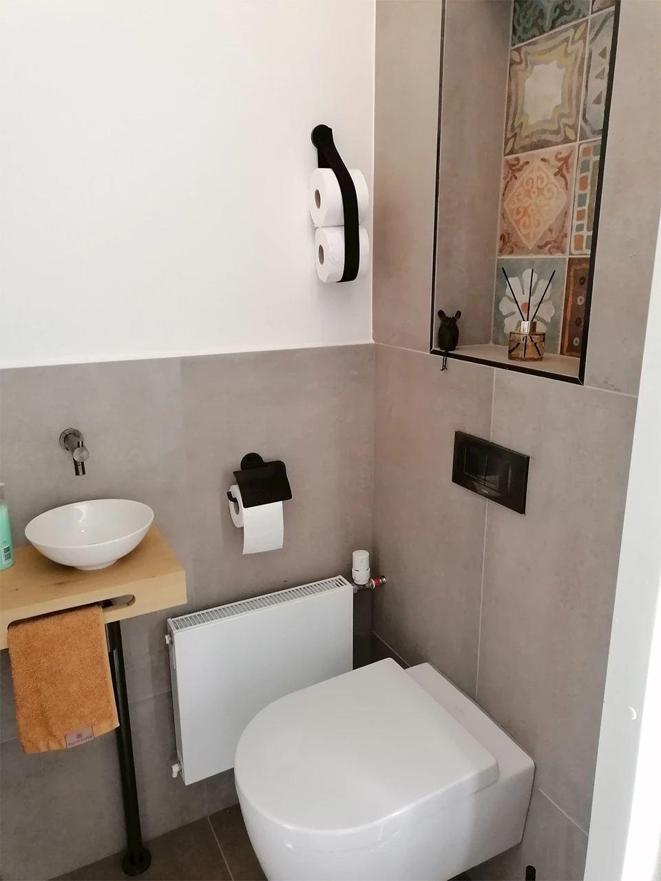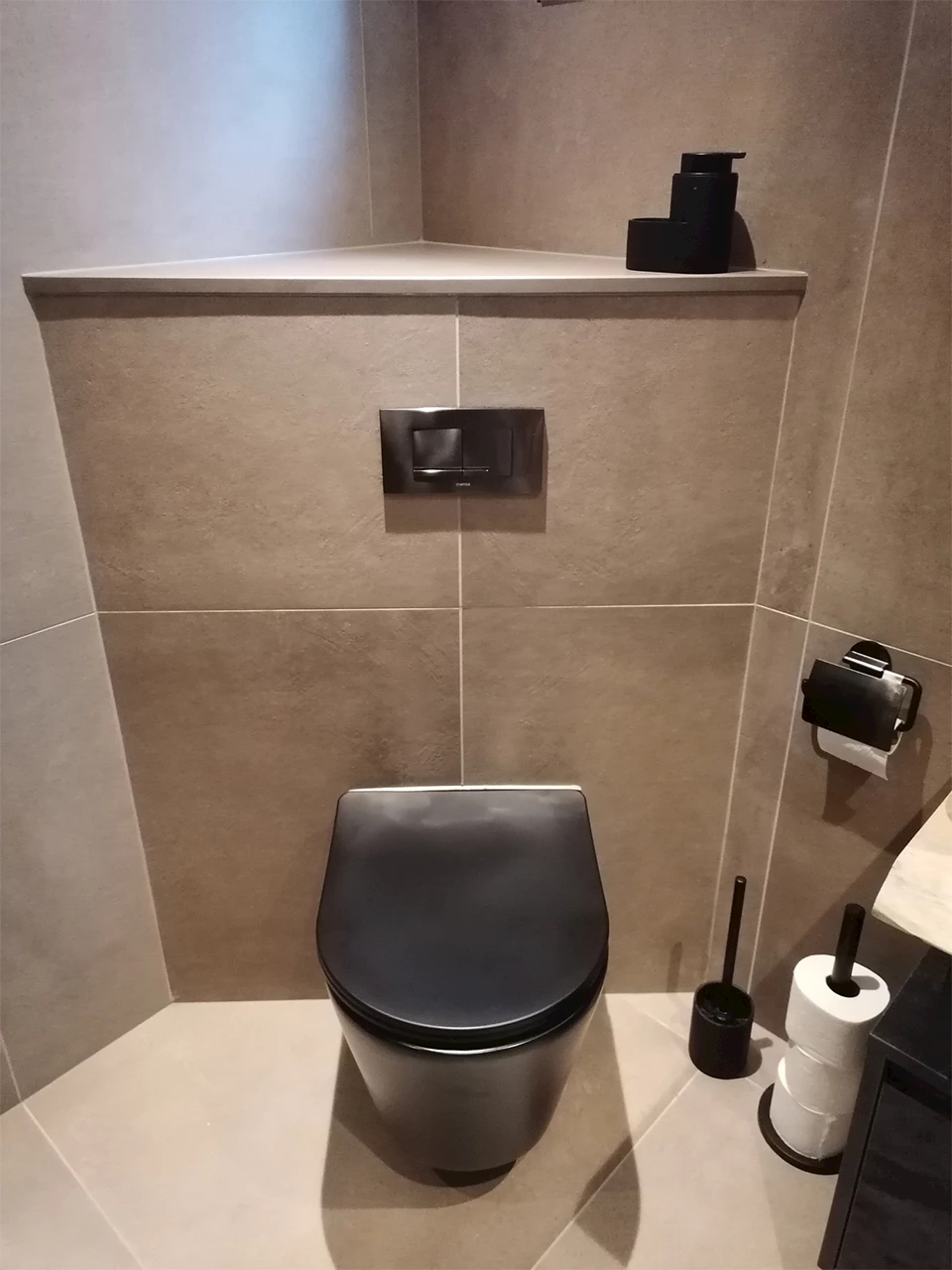 Naast een badkamer heeft de familie Hagendijk ook een nieuwe toiletruimte uitgezocht. Gekozen is voor een tegelcombinatie bestaande uit tegels in de kleur Light Grey en dezelfde decortegels als in de badkamer. De toiletset bestaat uit een Wisa inbouwreservoir en bedieningspaneel in de kleur Titanium Zwart. Het wandcloset is van Villeroy & Boch en is voorzien van een hoge zitting met softclose en Quick Release. Door het Quick Release systeem kun je de toiletbril eenvoudig van de pot afhalen. Waardoor je het toilet dus makkelijker schoon kunt maken.
