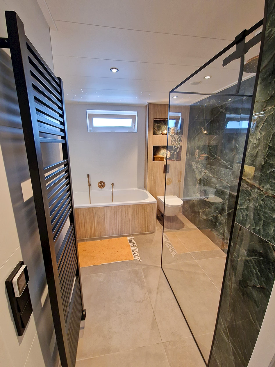 De familie was op zoek naar een wellness badkamer om in te kunnen onthaasten, dat is zeker gelukt! De doucheruimte bestaat uit een inbouw regendouche met handdouche in de kleur Sunset Brushed. Daarnaast is er gekozen voor een infrarood douche van Sunshower. Deze zorgt voor het echte wellness gevoel. Om het ruimtelijke gevoel te behouden, maar te voorkomen dat de rest van de ruimte nat spettert, is er een minimalistische douchewand geplaatst. Ook in het luxe ligbad kan de familie heerlijk ontspannen. Er is gekozen voor een dieper en langer bad, waardoor je er languit in kunt liggen. Boven het bad is een heel uniek element geplaatst: een plafond met sterrenhemel. Zeg nou zelf, er is vrijwel niks zo rustgevend als kijken naar de sterren