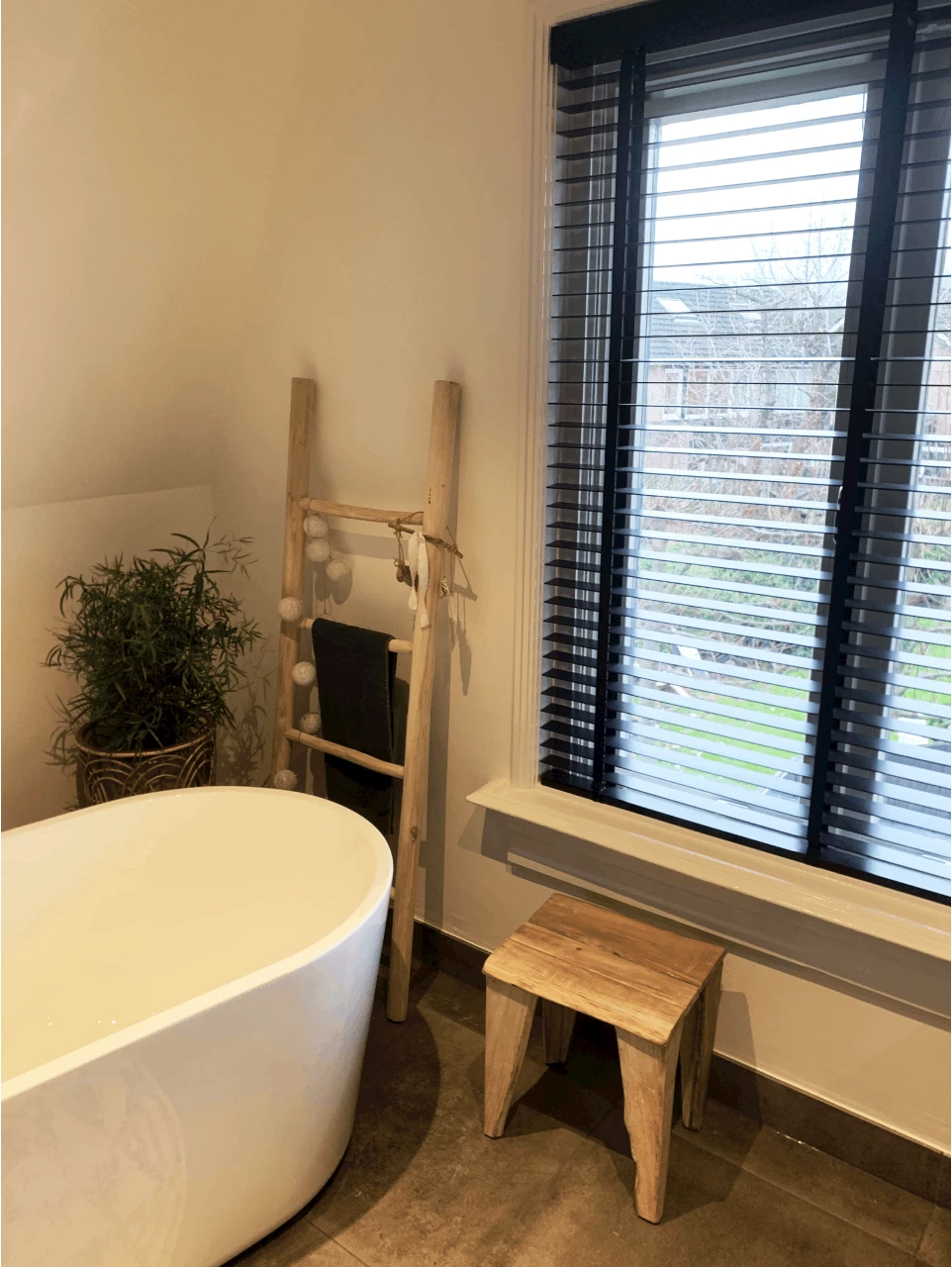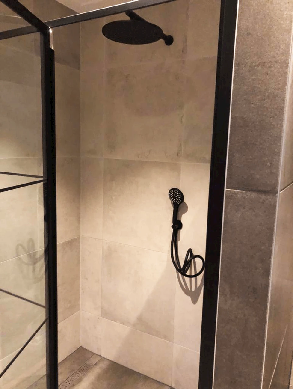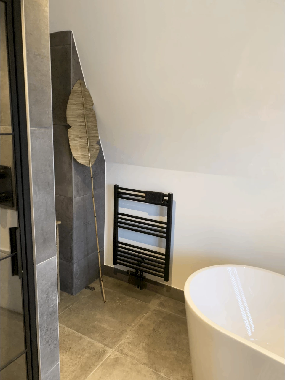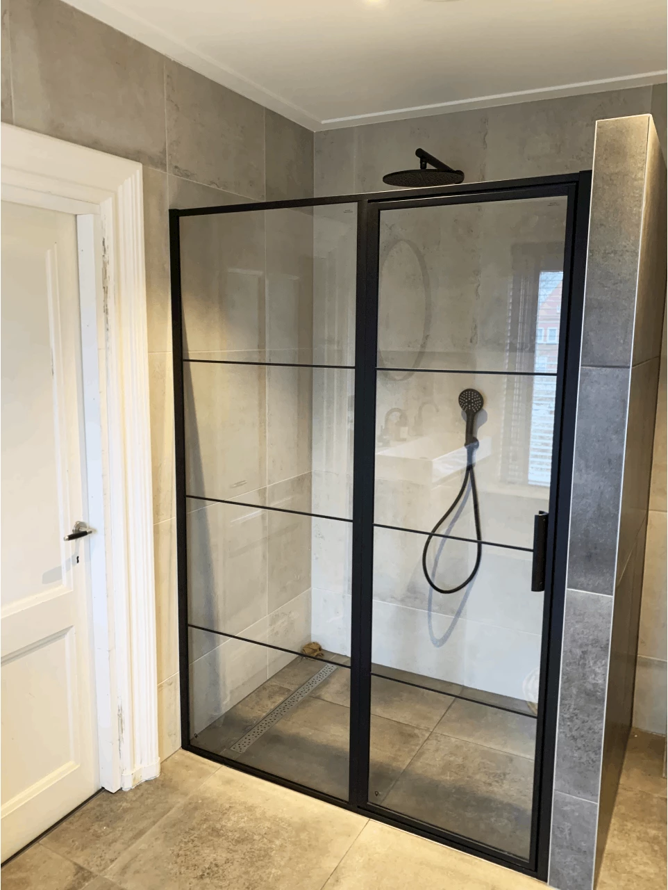 In de ruimte staat een prachtig vrijstaand bad voor een extra wellness gevoel. Het bad is vervaardigd uit hoogwaardig acryl. De doucheruimte wordt afgesloten door een triple framed nisdeur met mat zwarte lijsten. De deur heeft 8 mm helder veiligheidsglas voorzien van NANO-coating. Handig! Zo blijven er minder snel waterdruppels op het glas staan waardoor er minder kans is op kalkvorming.