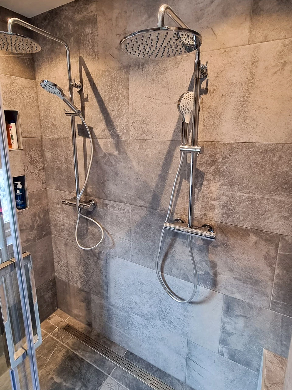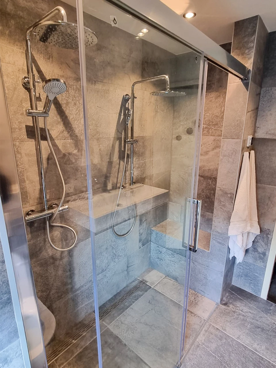 De keuze voor chroom komt op meer plekken terug. De familie heeft niet voor één, maar twee chromen regendouches gekozen. Beide zijn voorzien van een losse handdouche. Hiermee kun je bijvoorbeeld eenvoudig de doucheruimte schoonmaken of even snel je haar wassen. Aan een van de zijdes is een zitje gecreëerd, hier kun je je doucheproducten op kwijt of even op zitten tijdens het douchen. Aan de andere kant is er gekozen voor een nis, waar de familie ook doucheproducten kwijt kan. De ruime doucheruimte wordt afgesloten door glazen schuifdeuren.