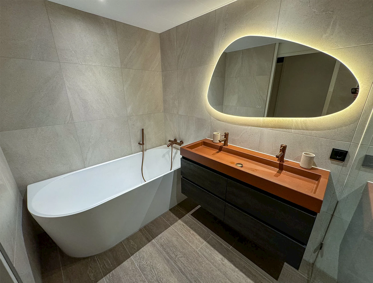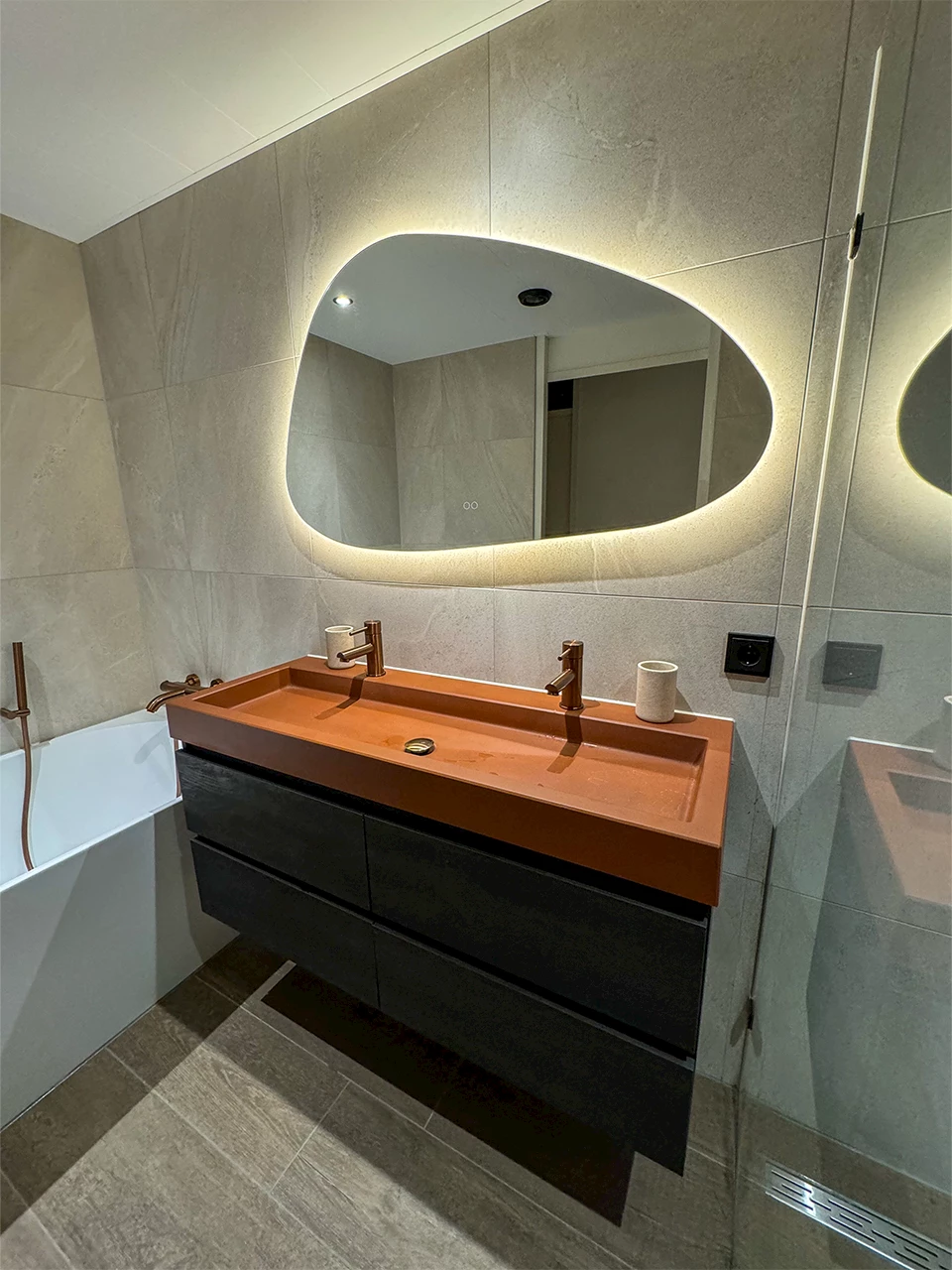 Het eerste wat in de prachtige badkamer je aandacht trekt is het badmeubel. Deze bestaat uit een onderkast in de kleur Coal Oak, wat een prachtige zwarte kleur is. Waar we vaak zien dat een zwarte kast gecombineerd wordt met een witte of zwarte wastafel, is de familie voor een heel andere optie gegaan. Op de onderkast is namelijk een betonnen wastafel in de kleur Terracotta gekozen. Een unieke kleur die de badkamer een luxe design uitstraling geeft. Het meubel is daarnaast gecombineerd met koperen wastafelkranen en een prachtige spiegel met een organische vorm.