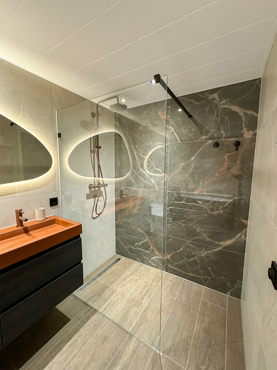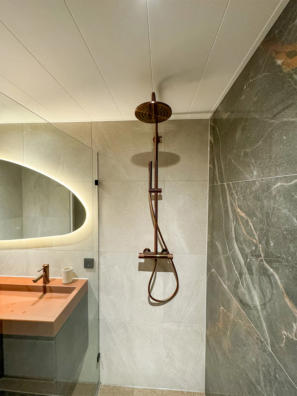 Niet alleen het meubel is uniek, ook de tegelcombinatie zien we niet iedere dag. Op de vloer is er gekozen voor houtlook tegels in de kleur Chalet Walnut, welke gecombineerd zijn met de lichte wandtegels in de kleur Bianco. De combinatie wordt afgemaakt door de prachtige marmerlook tegels in de kleur Riscal Brown. Deze marmerlook tegels hebben een bruine ader, wat perfect combineert bij het meubel. Door de marmerlook tegels alleen in de wand in de doucheruimte te plaatsen, blijft de rustige stijl van de ruimte behouden. Bovendien combineren de tegels prachtige met de koperkleurige douchekranen!