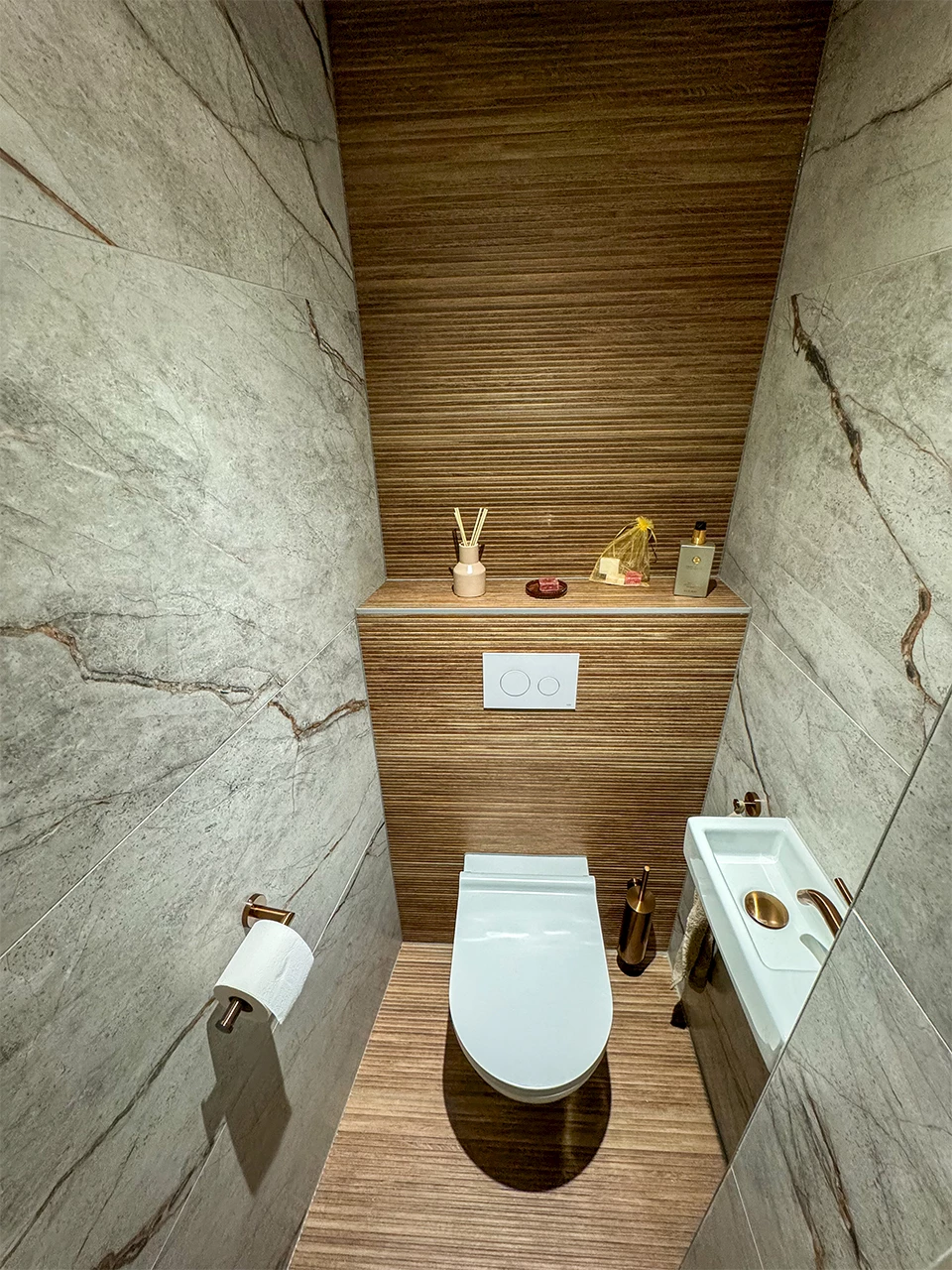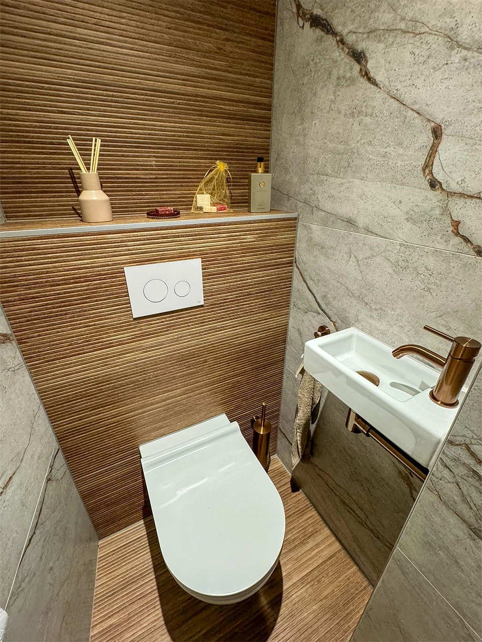 De toiletruimte is van een heel andere combinatie voorzien en heeft een wat lichtere en warmere uitstraling. De vloer en de wand achter het toilet zijn bekleed met reliëf tegels in de kleur Larchwood Ipe, deze zijn gecombineerd met de lichte marmerlook tegels. De toiletruimte is voorzien van wit sanitair, wat gecombineerd is met koperkleurige accenten. Denk bijvoorbeeld aan de fonteinkraan en de toiletaccessoires. De keuze voor koperkleurige accenten past prachtig bij de warme uitstraling van de houtlook tegels.