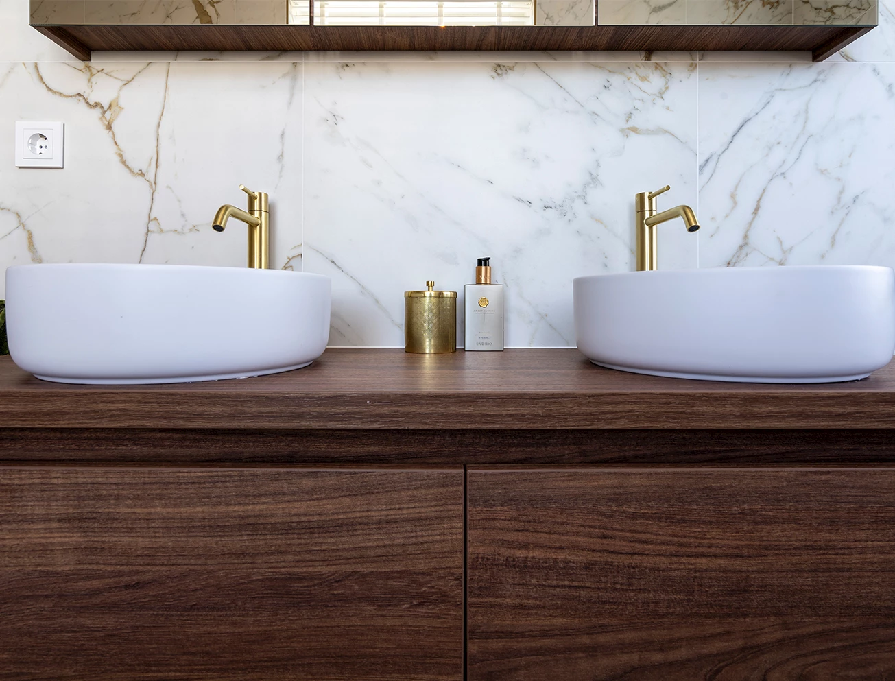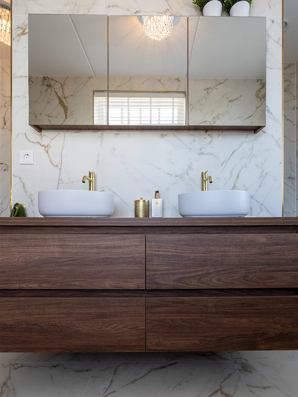 Ook in de luxe badmeubel combinatie is goud verwerkt. Het meubel bestaat uit een brede onderkast in de kleur Infinity Noten en twee mat witte waskommen. Op het meubel zijn twee goudkleurige wastafelkranen geplaatst, welke prachtig combineren bij de warme kleur van het meubel. Boven het meubel hangt een ruime spiegelkast, waarvan de zijkanten ook zijn voorzien van houtlook in de kleur Infinity Noten.