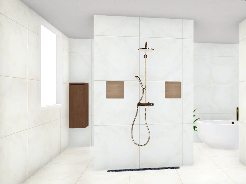 In de volledige ruimte is er dus gekozen voor marmerlook tegels. De familie is gegaan voor lichte tegels met een bruine ader. Doordat er voor een lichte tegel gekozen is, oogt de ruimte ook rustig. Bruin combineert natuurlijk goed met goud. De familie Kwakman heeft daarom dan ook gekozen voor goudkleurige elementen die op verschillende plekken in de badkamer terugkomen. Zo hebben de badkraan, de luxe regendoucheset en de nissen in de douche allemaal een gouden kleur. Het combineert niet alleen goed met de tegels, door de gouden kleur op verschillende plekken terug te laten komen ontstaat er ook eenheid.