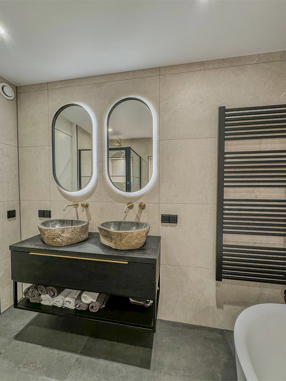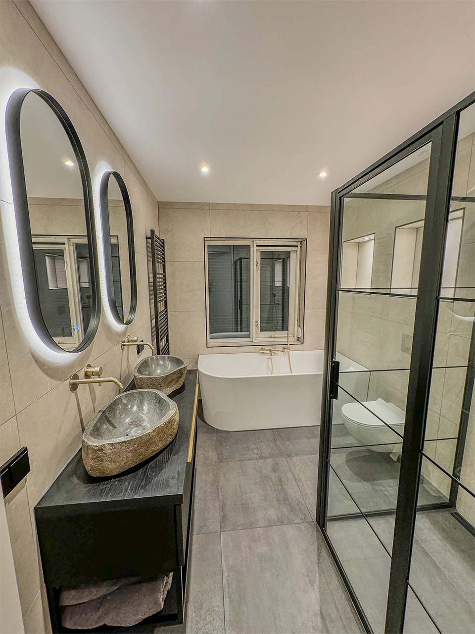 De familie heeft gekozen voor een luxe badmeubelset. Deze bestaat uit een onderkast in de kleur zwart, twee natuurstenen waskommen en twee ovale spiegels welke voorzien zijn van een mat zwart frame. Aan de set zijn twee geborsteld messing kranen toegevoegd die de luxe set helemaal afmaken. Tegenover het badmeubel bevindt zich de doucheruimte die bestaat uit een geborsteld messing regendoucheset en een douchecabine met een mat zwart frame. Ook hierbij komt de keuze voor geborsteld messing en mat zwart dus terug. Naast dat deze badkamer een prachtige uitstraling heeft, kan de familie ook heerlijk tot rust komen in deze ruimte. Want naast een regendouche, is er ook gekozen voor een ruim semi-vrijstaand ligbad.