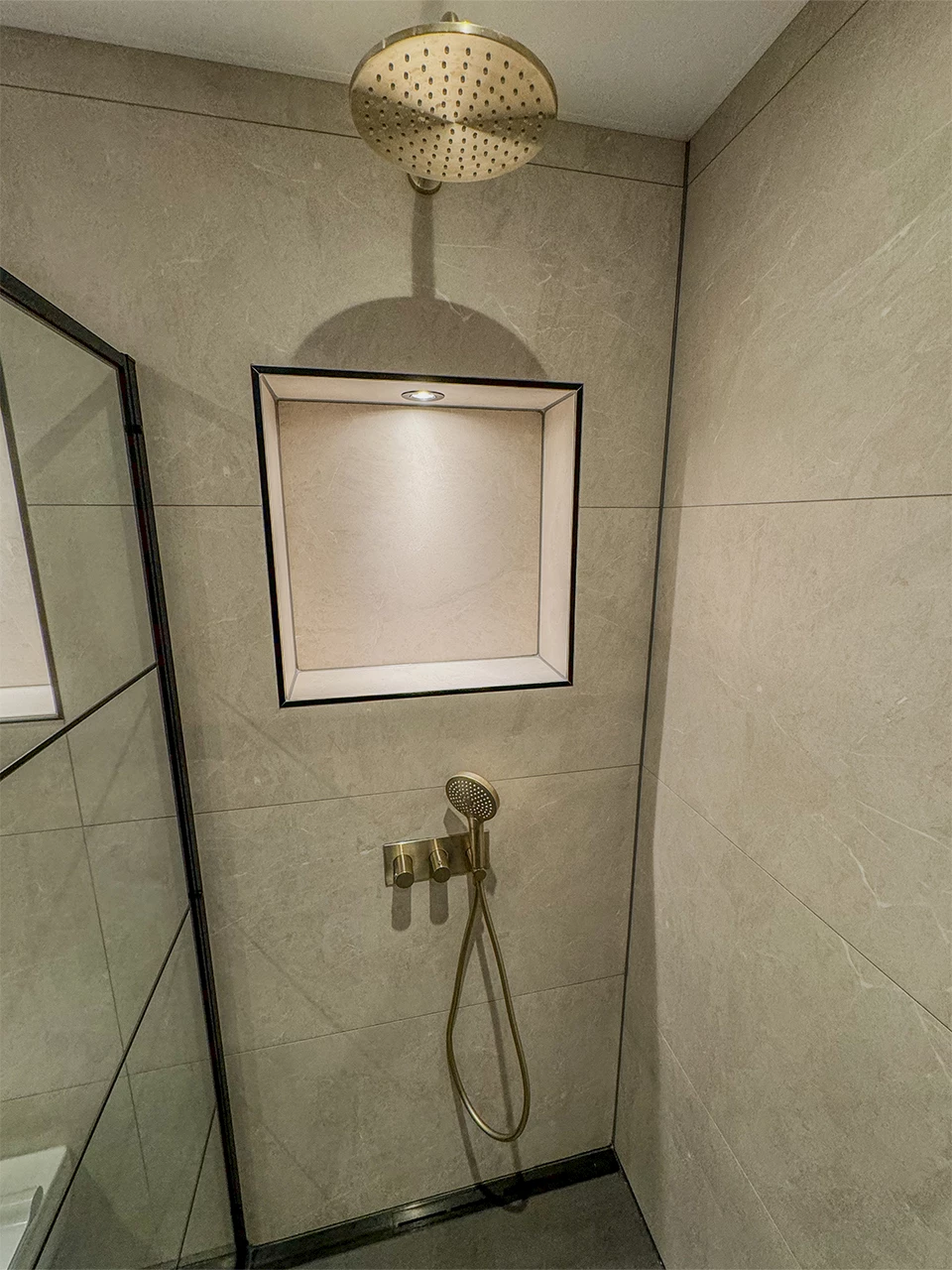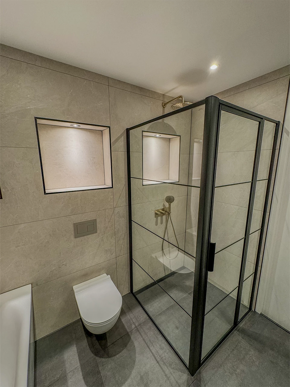 Deze warme badkamer en toiletruimte zijn opgeleverd door Sani4All Genemuiden bij de familie Noorland uit IJsselmuiden. De combinatie van de lichte tegels, mat zwarte elementen en geborsteld messing accenten zorgen voor een prachtige luxe uitstraling.