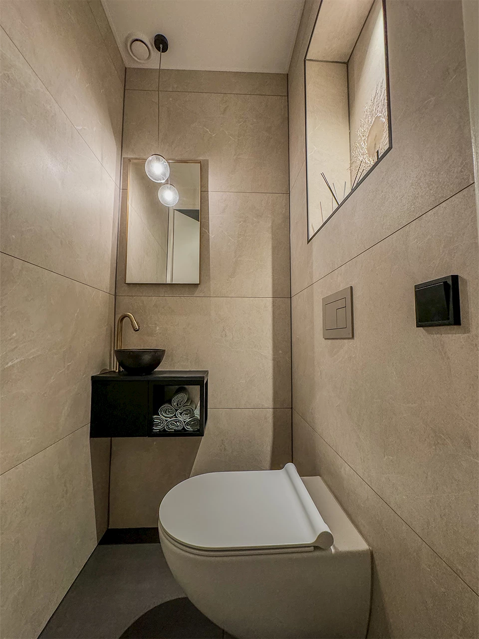 Ook in de toiletruimte zijn de lichte tegels gecombineerd met mat zwart en geborsteld messing. De fonteinset bestaat uit een mat zwart kastje, een mat zwarte waskom en een geborsteld messing fonteinkraan. Het geheel wordt afgemaakt door de spiegel met een geborsteld messing frame. Het wandcloset heeft een witte kleur, welke de rust in de ruimte behoudt.
