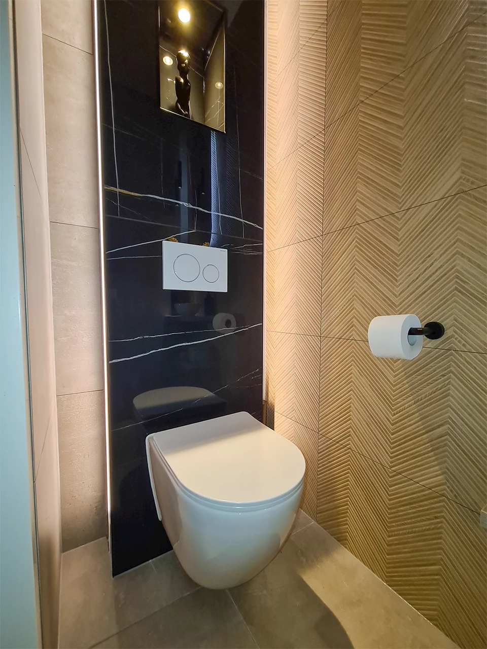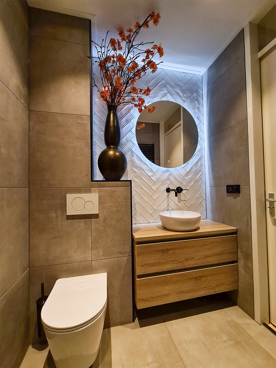 In de toiletruimte zijn de taupe tegels ook op de vloer en een deel van de wanden geplaatst. In deze ruimte is de familie voor een hele andere combinatie gegaan. Op een deel van de wanden zijn houtlook visgraat tegels in de kleur warm eiken geplaatst. Maar de prachtige zwarte marmerlook tegels vormen toch wel de eyecatcher in deze ruimte. Achter de marmerlook tegels is het inbouwreservoir geplaatst, waardoor er ruimte ontstaat voor sfeerverlichting. Die sfeerverlichting geeft deze ruimte een prachtige exclusieve uitstraling. De ruimte wordt afgemaakt door de fonteinset, welke bestaat twee planchetten, een witte waskom en een mat zwarte fonteinkraan.