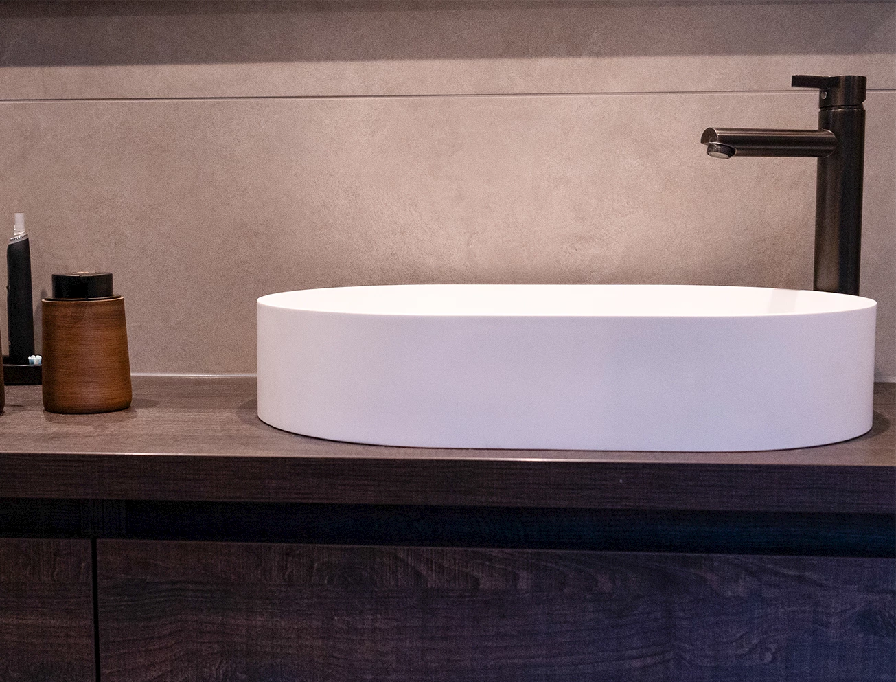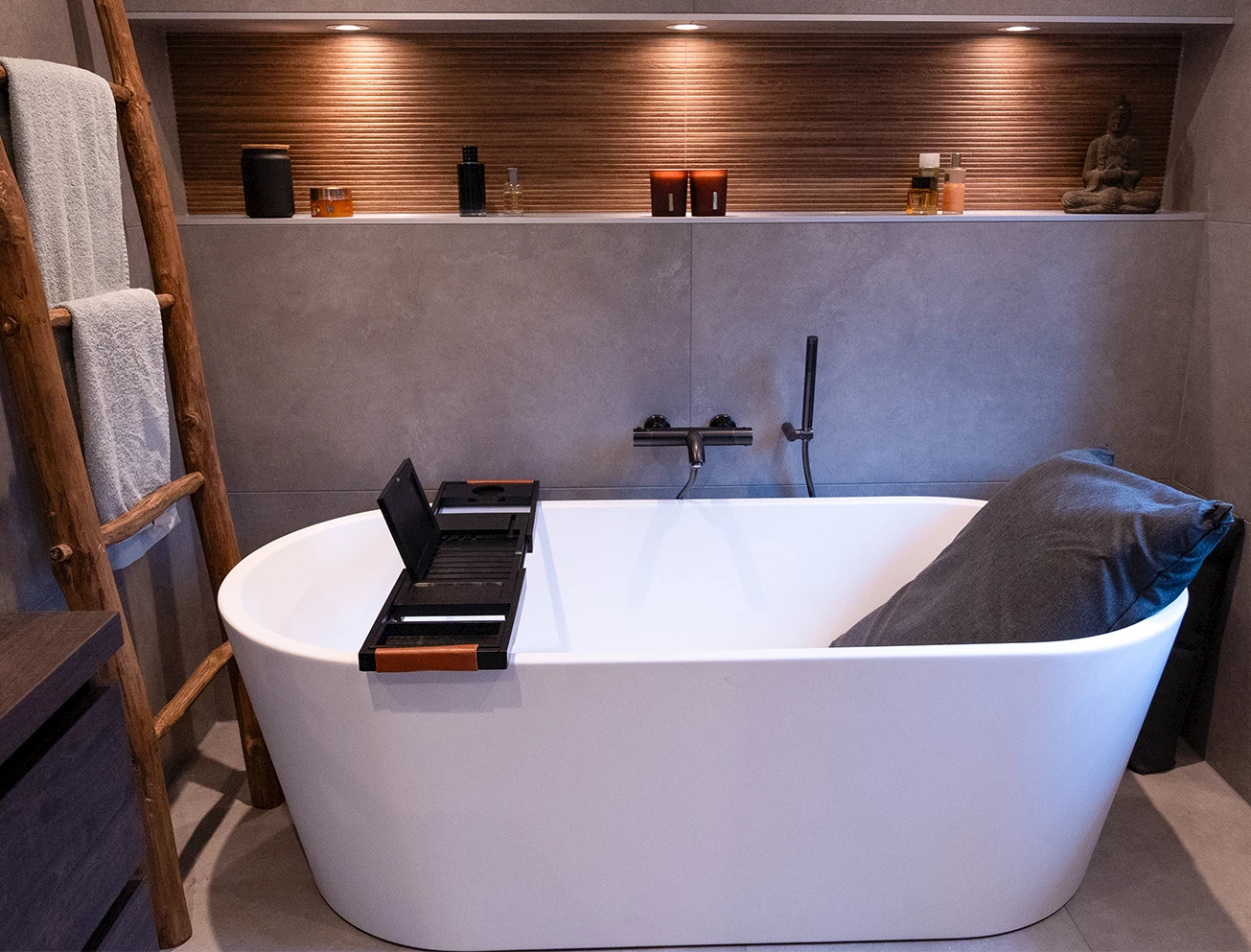 Deze badkamer heeft niet alleen een warme en ontspannen uitstraling, het biedt ook nog eens de mogelijkheid om er helemaal in tot rust te komen. Naast de luxe regendouche is de badkamer namelijk ook voorzien van een vrijstaand ligbad. Deze biedt voldoende ruimte om heerlijk languit in te gaan liggen! De keuze voor Gun Metal komt ook hierin terug, er is namelijk gekozen voor een Gun Metal badkraan.