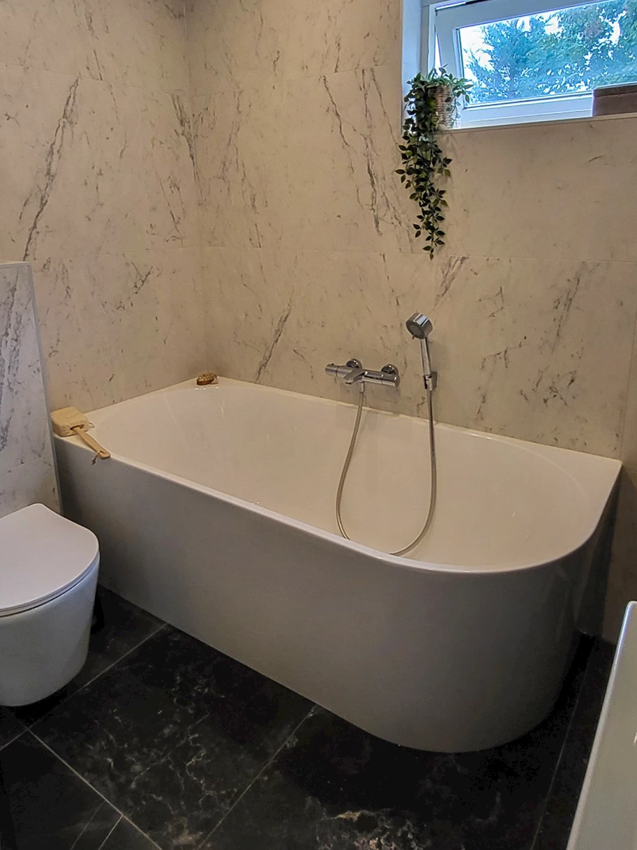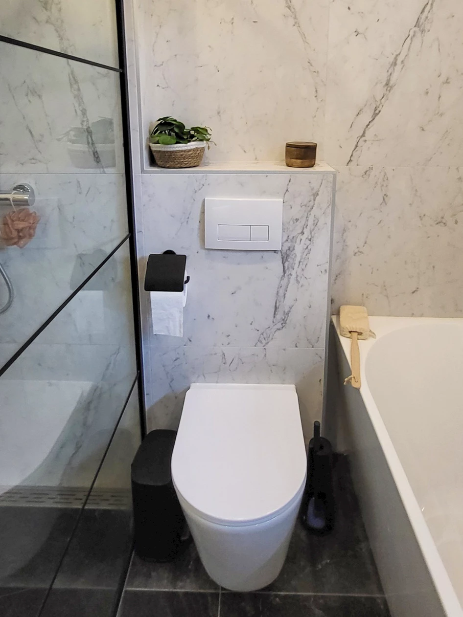 De badkamer van de familie Teule heeft een flinke transformatie ondergaan. De wat verouderde badkamer is vervangen voor een prachtige moderne marmerlook badkamer. De familie heeft samen met Sani4All Genemuiden deze prachtige badkamer gerealiseerd.