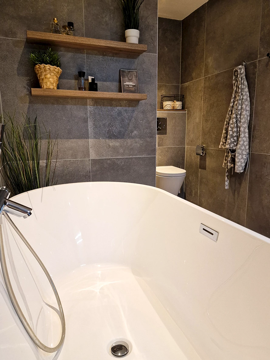 Zoals je kunt zien zijn zowel de badkamer als de toiletruimte aangekleed met verschillende accessoires. Zo heeft de familie gekozen voor verschillende toiletaccessoires in de kleur Chroom, deze zijn niet alleen praktisch maar ook stijlvol. Daarnaast zijn er plankjes boven het bad aan de wand bevestigd. Deze plankjes hebben, net zoals het badmeubel, de kleur Tabacco. Ideaal om je badkamer aan te kleden net wat extra accessoires! Op beide inbouwreservoirs zijn planchetten geplaatst, welke ook de kleur Tabacco hebben. Dit geeft de toiletten een net wat warmere en sfeervollere uitstraling.