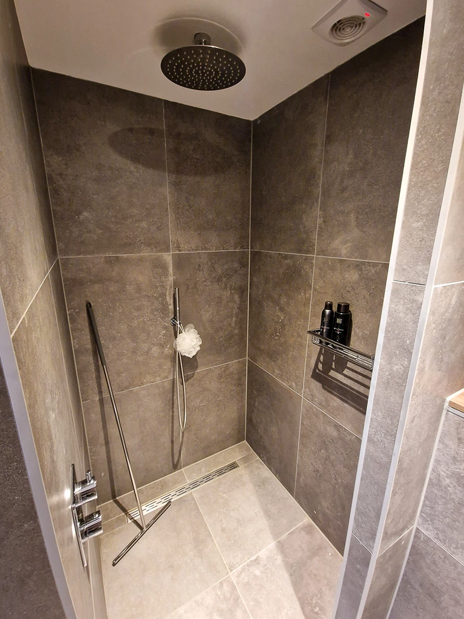De badkamer is voorzien van een ruime inloopdouche met een heerlijke regendoucheset. Deze set heeft de kleur Chroom en is voorzien van een ronde regendouche en een losse handdouche. Naast de doucheruimte heeft de familie ook een vrijstaand ligbad toegevoegd aan de badkamer, welke is voorzien van Chromen kranen. De keuze voor Chromen kranen komt dus in de gehele ruimte terug. Dit zorgt voor rust en eenheid in de ruimte.