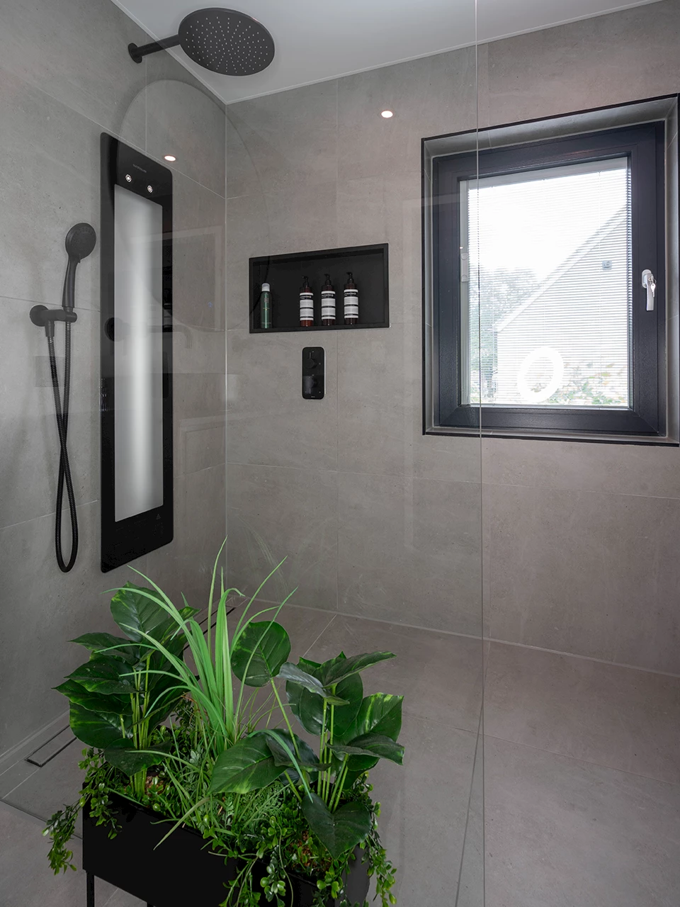 De keuze voor mat zwart komt op veel meer plekken in de badkamer terug. Zo hebben ook de ingebouwde regendoucheset en de inbouwnis een mat zwarte kleur. Dit past natuurlijk erg goed bij de moderne stijl van deze badkamer. Zelfs de Sunshower is in het mat zwart uitgevoerd. Deze infraroodlamp is vooral in de winter een fijne toevoeging aan de badkamer. Ook in de toiletruimte is er gekozen voor mat zwart. Zowel de fonteinset, als het toilet en het drukpaneel hebben een mat zwarte kleur. Hierdoor passen beide ruimtes goed bij elkaar!