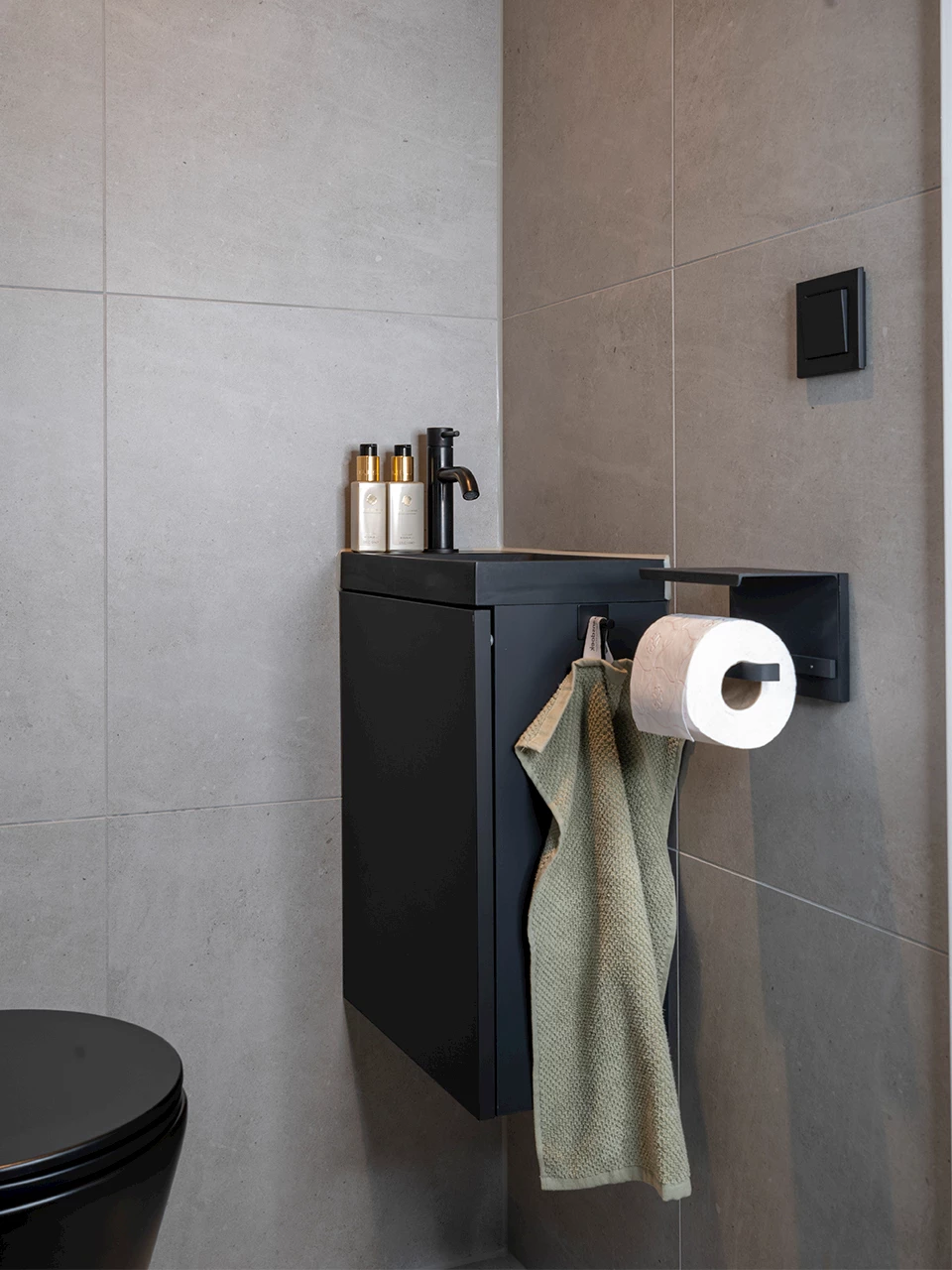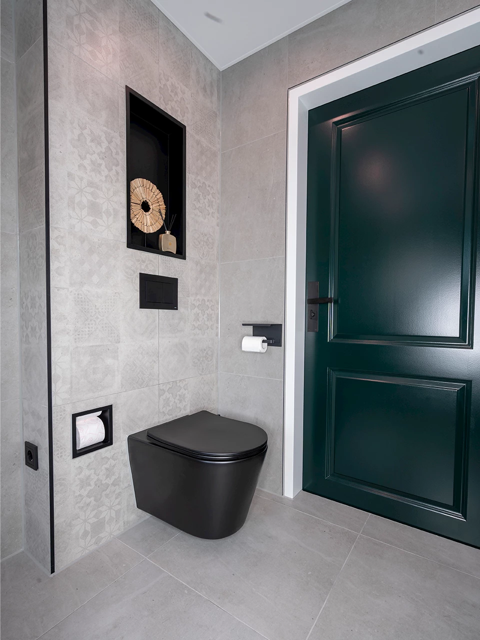 De familie heeft in beide ruimtes gekozen voor dezelfde tegelcombinatie. Deze bestaat uit 60x60 cm tegels in de kleur Grijs Mat en Portugese decortegels in een grijze kleur. De decortegels zijn op subtiele wijze toegevoegd aan beide ruimtes. In de toiletruimte zijn de tegels in de nis geplaatst en in de badkamer achter het toilet. De basis van beide ruimtes is door de keuze van de grijze tegels rustig, wat voor de moderne stijl van de ruimte zorgt.