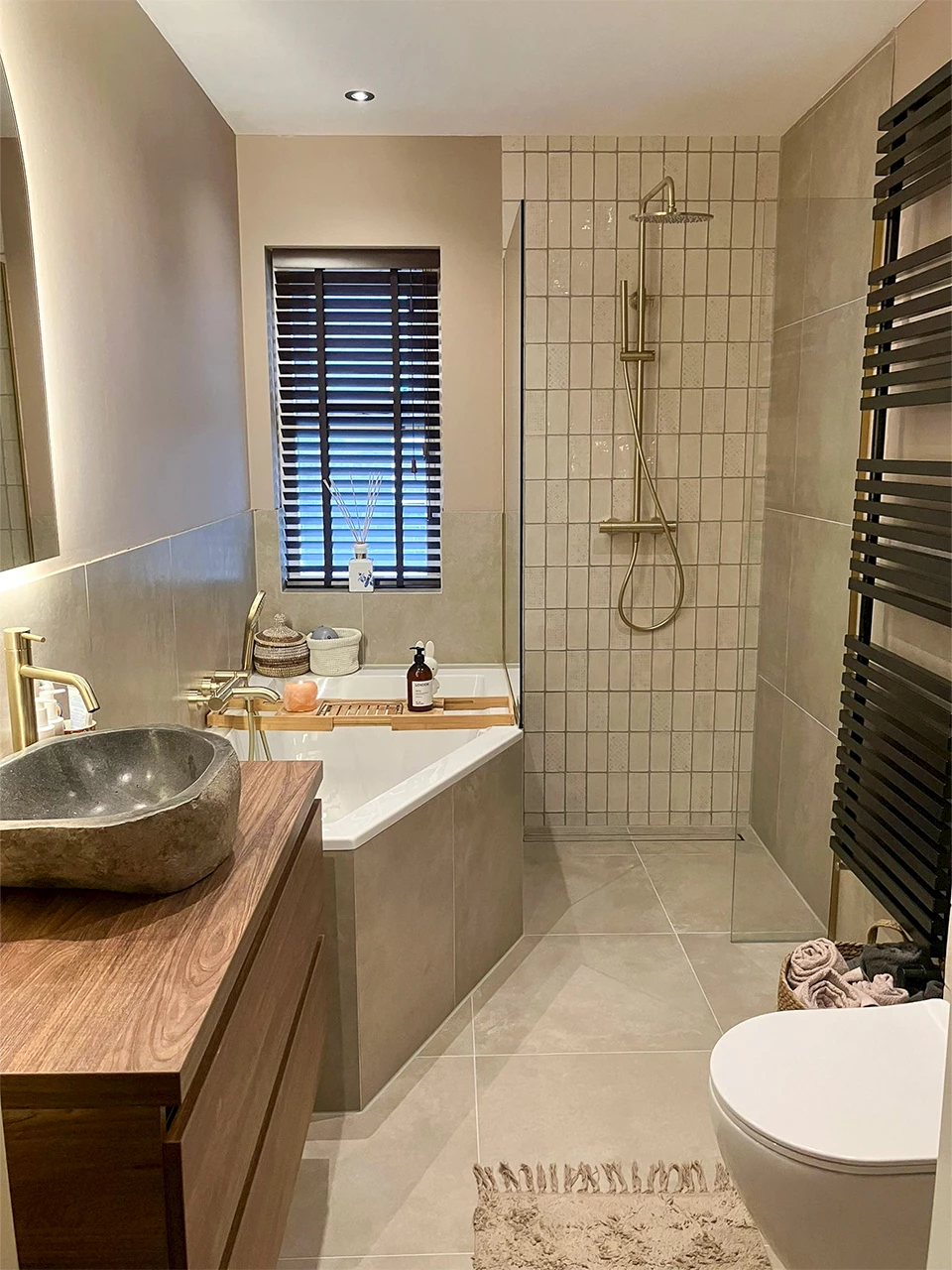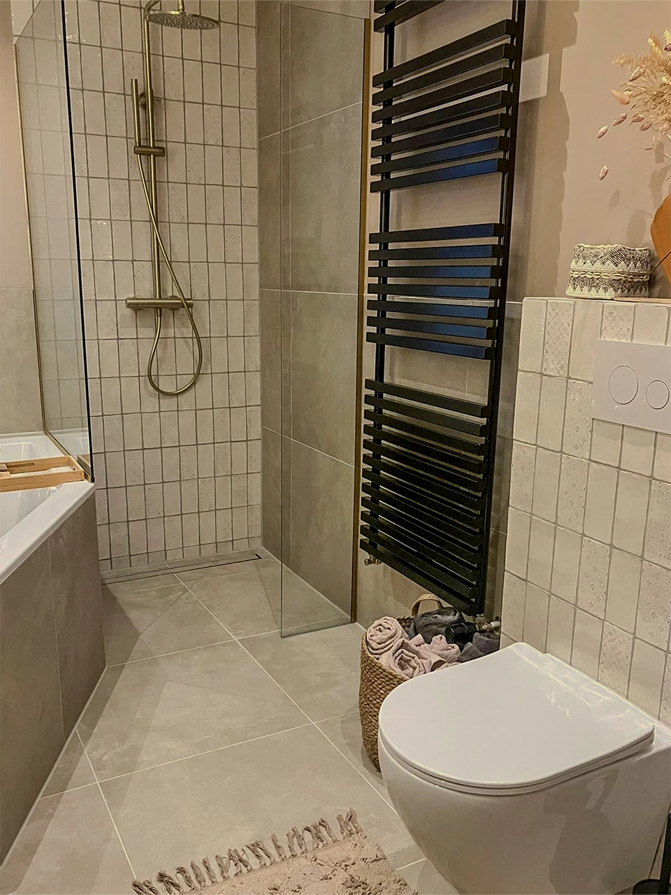 De basis van de badkamer bestaat uit warme tegels in de kleur Recover Beige. Deze tegels zijn op de vloer en een deel van de wanden geplaatst. Het inbouwreservoir en de achterwand van de doucheruimte zijn bekleed met decortegels in de kleur Belle. Op het eerste oog lijken dit gewone beige decortegels, maar wanneer je goed kijkt zijn een deel van de tegels voorzien van een print. De familie heeft ervoor gekozen niet de volledige ruimte te bekleden met tegels, maar ook een deel te laten stucen. Dit zorgt ervoor dat er een rustige sfeer in de ruimte ontstaat.