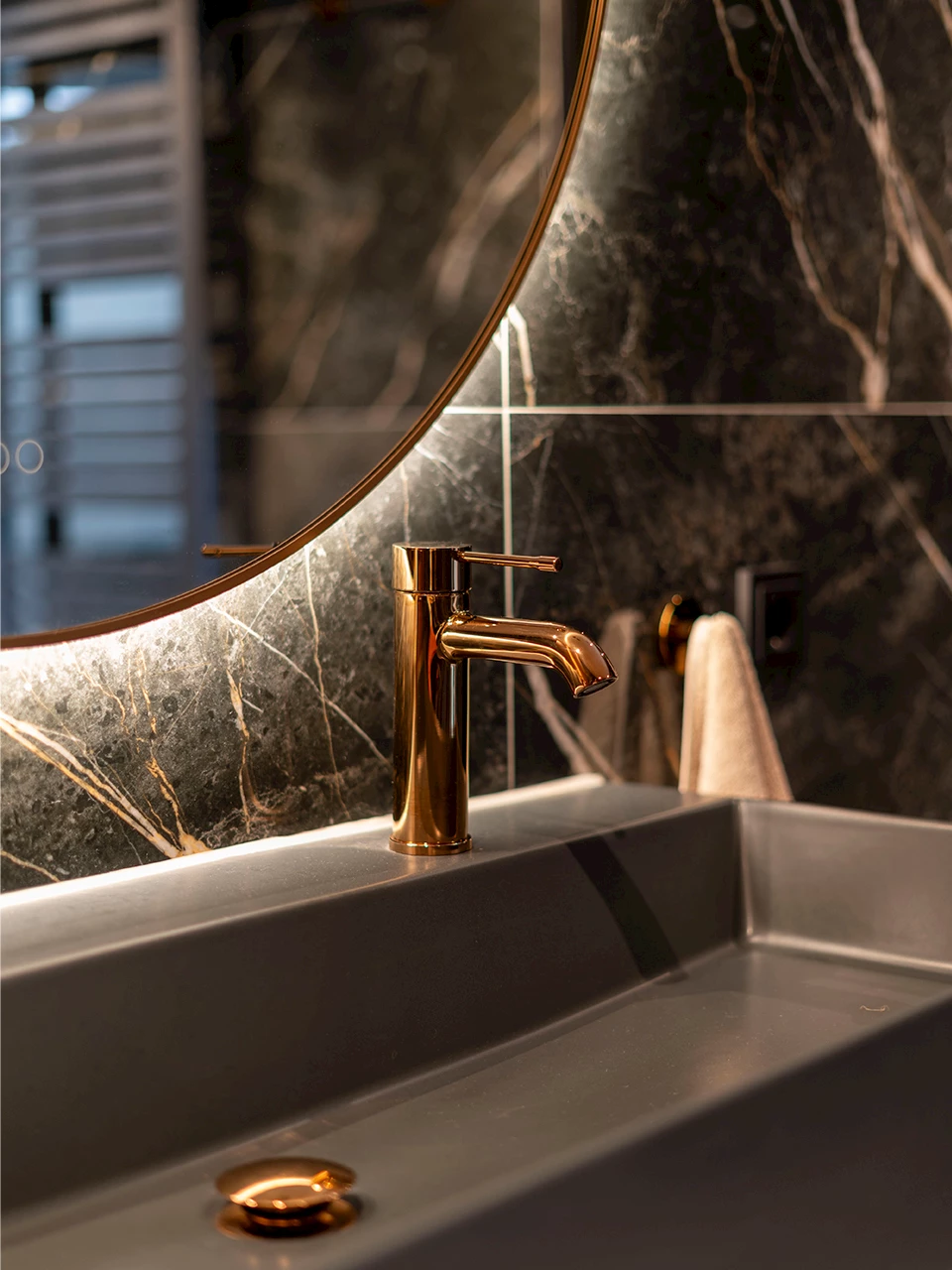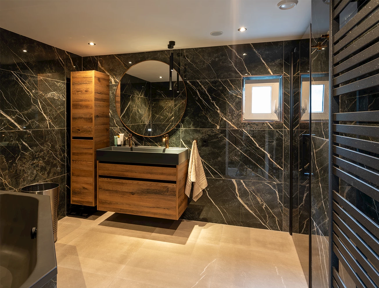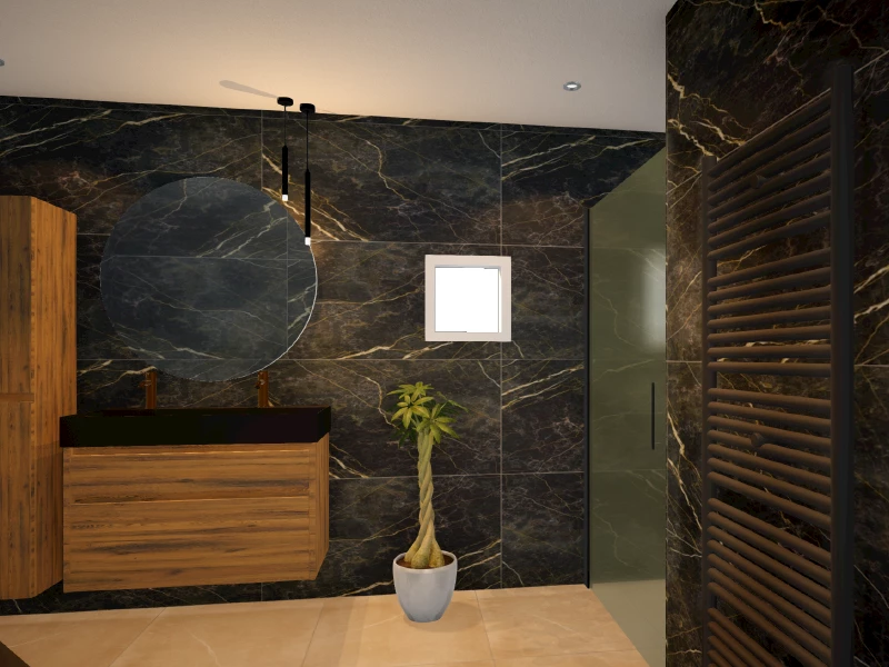 In de badkamer is er gekozen voor donkere marmerlook wandtegels met witte en koperkleurige aders. Deze zijn gecombineerd lichte zandkleurige vloertegels. Ondanks dat er gekozen is voor donkere wandtegels oogt de badkamer niet donker. De badmeubelset bestaat uit een onderkast en een kolomkast in de warme houtlook kleur Raw Oak. Op de onderkast is een mat zwarte wastafel geplaatst. De wastafekranen hebben de kleur Warm Sunset, een koperkleurige kleur die mooi bij de koperkleurige ader van het marmerlook past. Ook in de ronde spiegel komt de koperkleur terug, deze is voorzien van een koperkleurige frame.