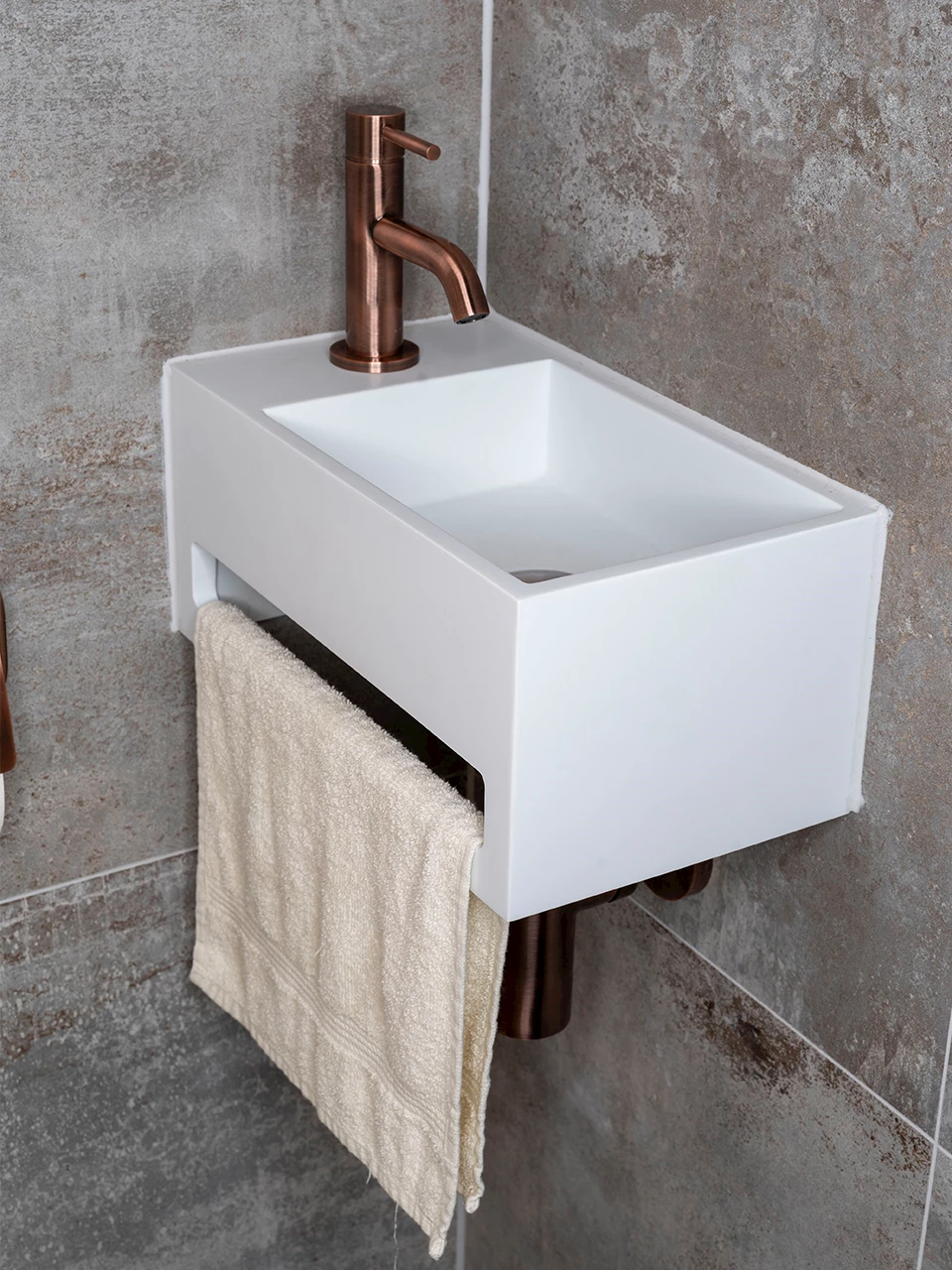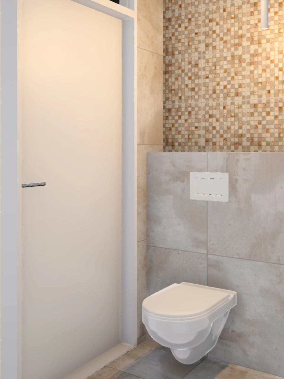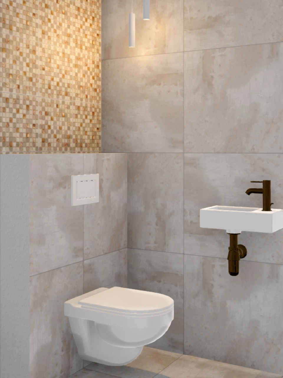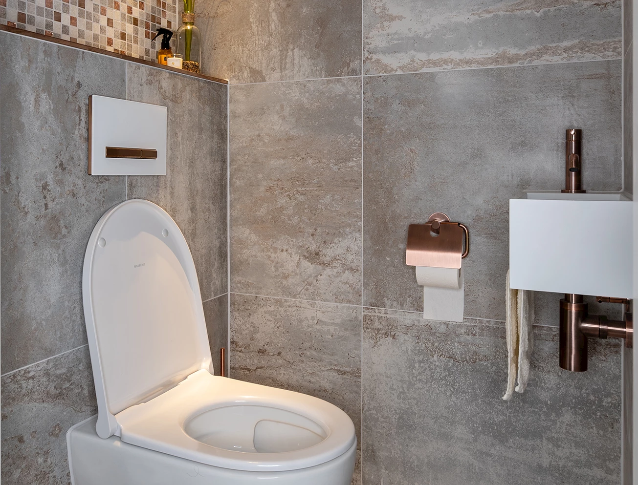 Waar de badkamer bestaat uit donkere kleuren, is er voor de toiletruimte juist voor lichte kleuren gekozen. De wandtegels hebben de unieke kleur Flatiron White en zijn gecombineerd met lichte betonlook tegels. Boven het inbouwreservoir zijn prachtige mozaïektegels geplaatst. Deze passen prachtig bij de keuze voor de koperkleurige fonteinkraan en toiletaccessoires. Ook in het drukpaneel komt de koperkleurige kleur terug. Ook van de toiletruimte wordt altijd een 3D-ontwerp gemaakt. Ondanks dat deze ruimte kleiner is, vinden we het net zo belangrijk dat je precies weet hoe de ruimte eruit komt te zien.