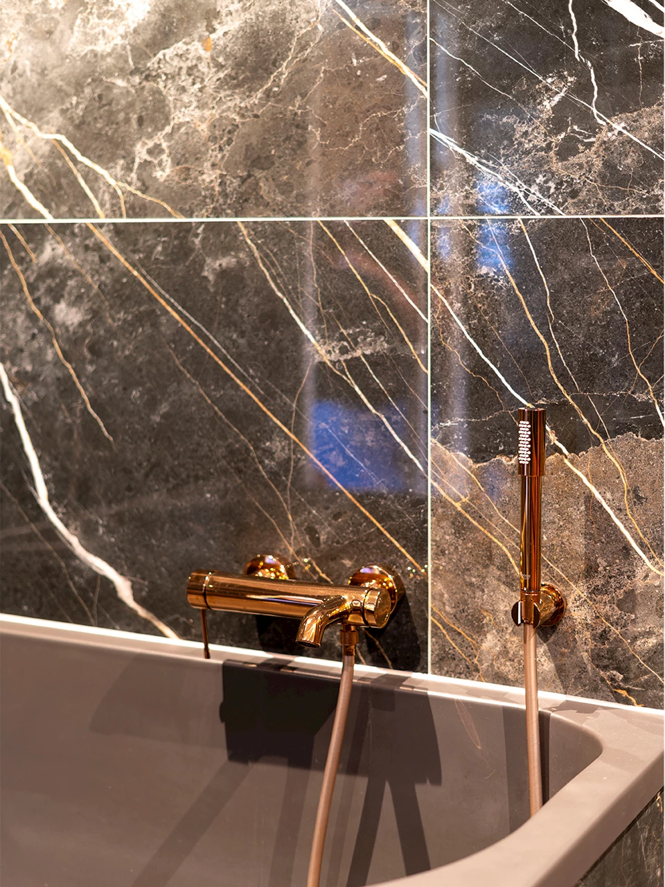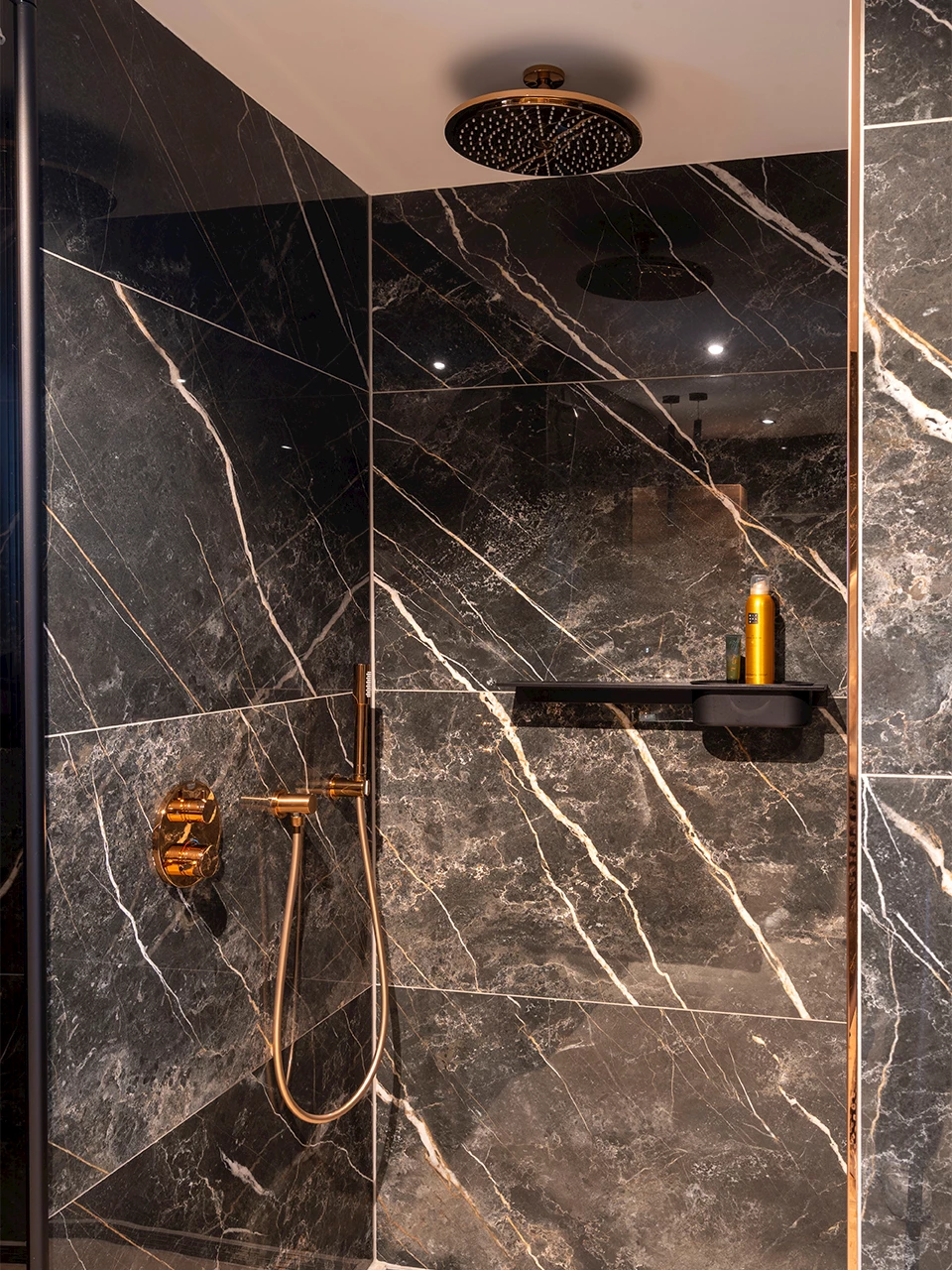 In de ruime doucheruimte is er ook gekozen voor koperkleurige kranen, wat voor eenheid in de ruimte zorgt. De luxe regendoucheset bestaat uit een ronde regendouche en een handdouche. Het heerlijke ligbad mogen we natuurlijk niet onbenoemd laten. Door de unieke vorm en antracieten kleur is dit een opvallende toevoeging aan de badkamer.