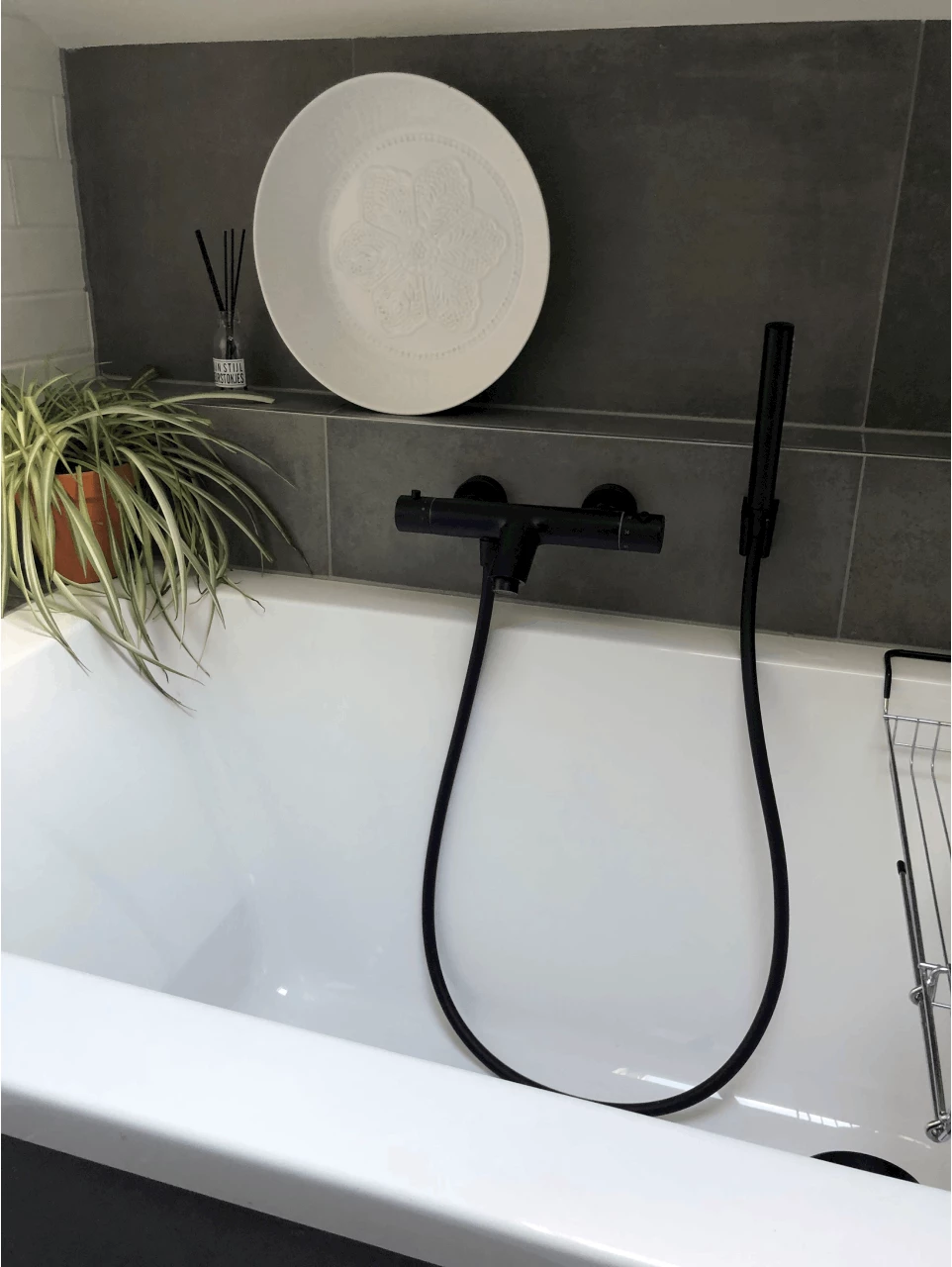 Deze badkamer is eenvoudig in kleurgebruik en juist daarom zo sprekend. Op de vloer en achter het bad is de antraciet grijze tegel Relli Notte gebruikt in de afmeting 60 x 60 cm. Op de wanden zitten trendy witte wandtegels met het formaat van 30,2 x 7,6 cm. Terugkerend zijn de mat zwarte elementen die je overal terugvindt in de ruimte: