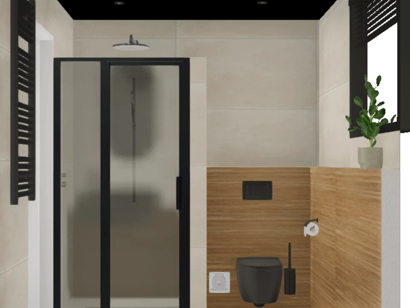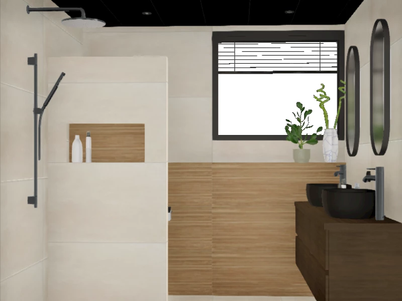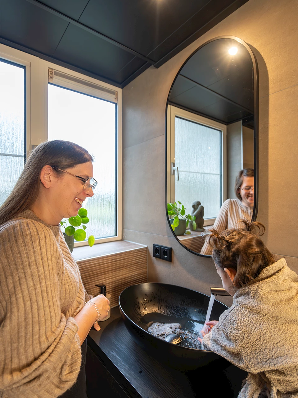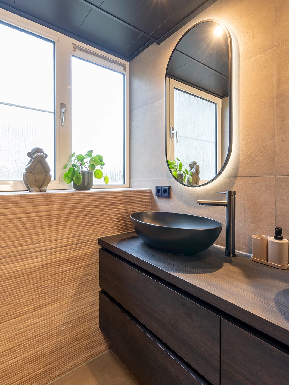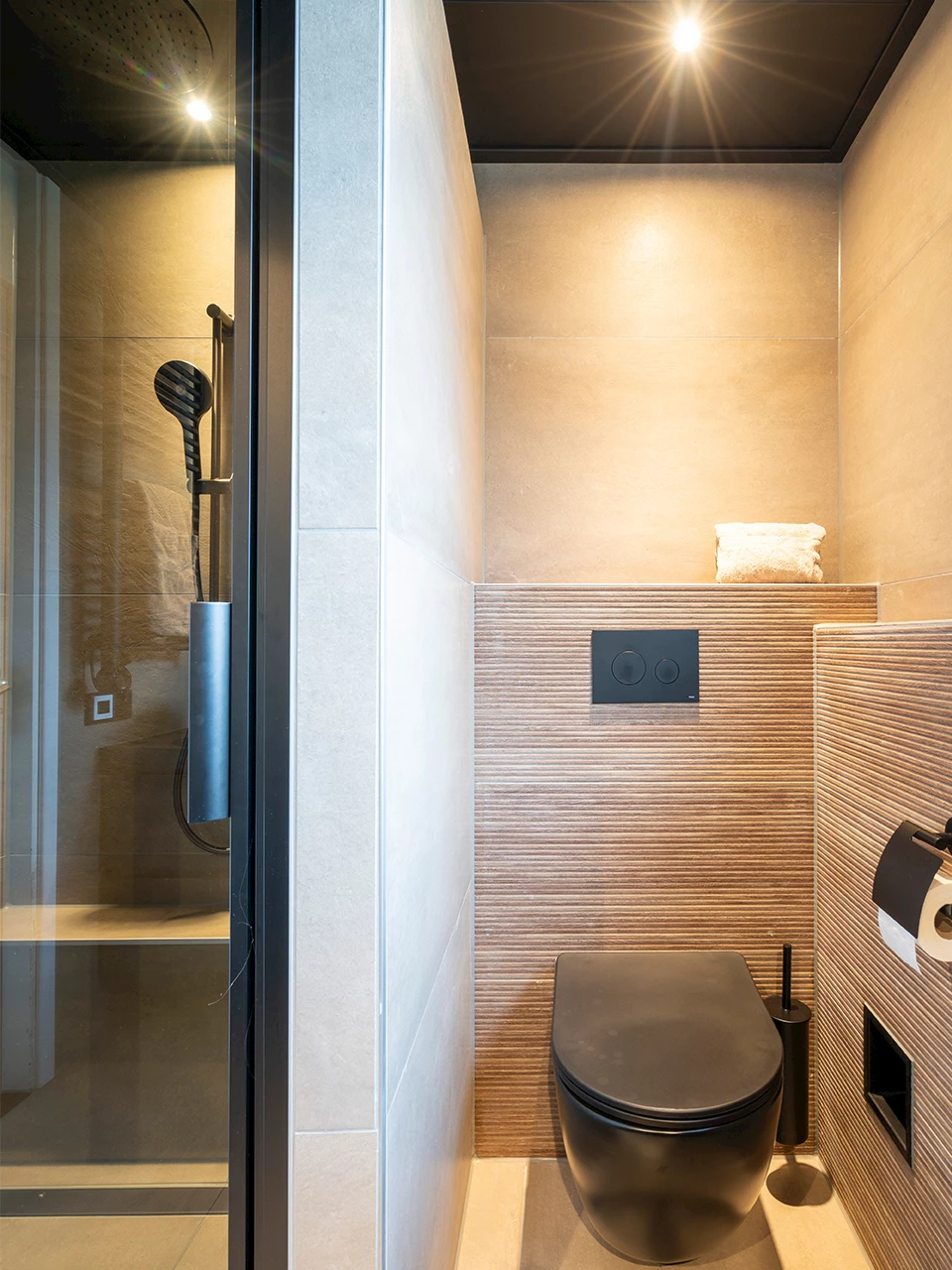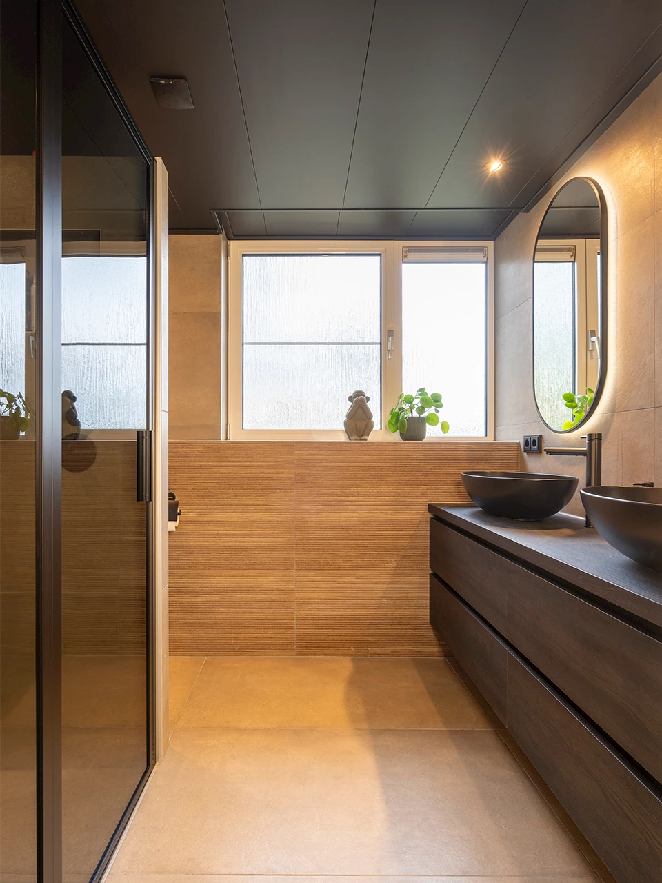 De warme sfeer van de badkamer ontstaat door het gebruik van natuurlijke materialen en contrasten, wat echt kenmerkend is voor de Japandi stijl. Joey en Charelle hebben gekozen voor lichte tegels, bestaande uit beige vloer- en wandtegels en houtlook tegels met een reliëf. Daar hebben zij een mat zwart plafond aan toegevoegd, wat voor een prachtig contrast zorgt.