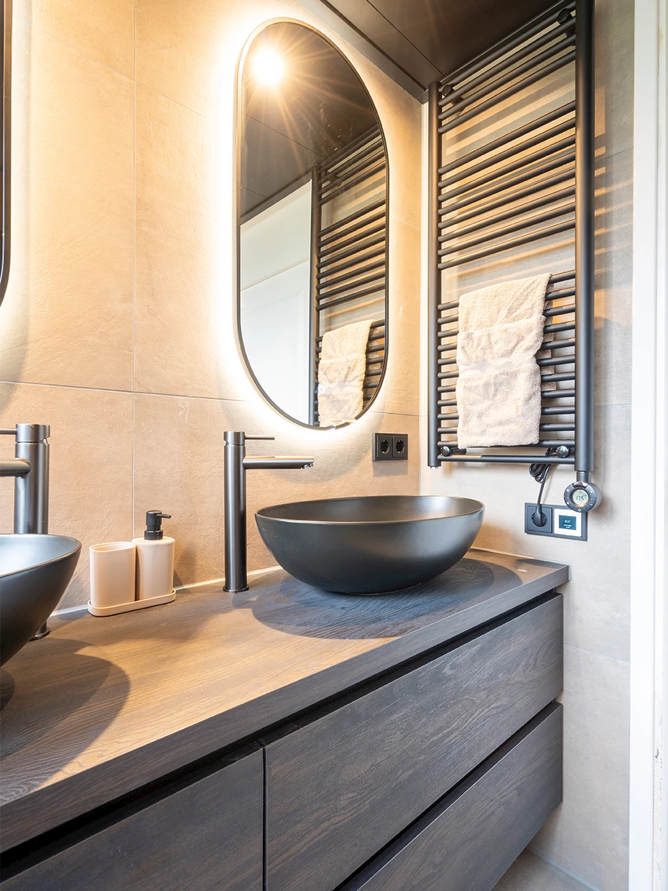 Het contract wordt versterkt door de donkere badmeubelset. Zij hebben gekozen voor een donkere houtlook onderkast in de kleur Coal Oak, twee mat zwarte waskommen en twee ovale spiegels met een mat zwarte omlijsting. De set wordt afgemaakt door twee Gun Metal wastafelkranen. Dit badmeubel is maar liefst 200 cm breed en biedt ruimte om bijvoorbeeld samen tanden te poetsen.
