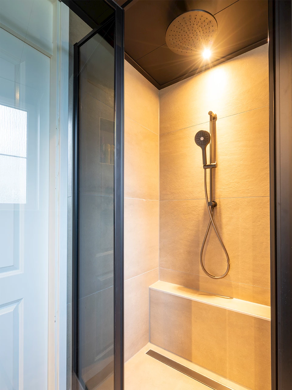 Niet alleen het brede meubel is erg praktisch, ook van de rest van de ruimte is optimaal gebruik gemaakt. De badkamer heeft een ruime doucheruimte, welke is voorzien van een Gun Metal regendoucheset. De ruimte wordt afgesloten door een prachtige rookglazen douchedeur met een mat zwart frame en een tussenwand. Aan de andere kant bevindt zich een toilet, bestaande uit een mat zwart wandcloset en een mat zwarte drukpaneel.